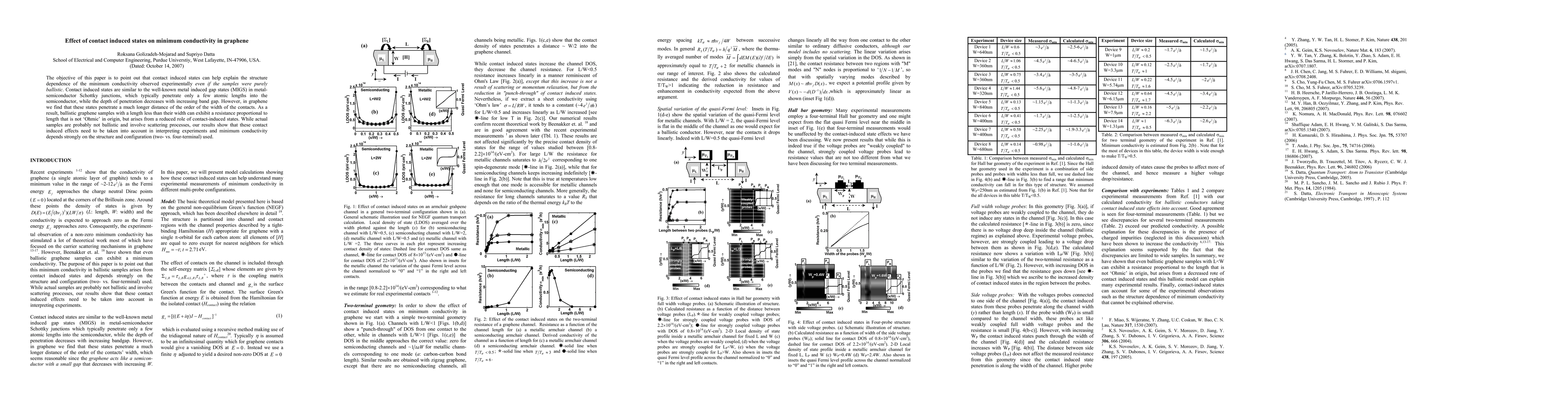 The objective of this paper is to point out that contact induced states can help explain the structure dependence of the minimum conductivity observed experimentally even if the samples were purely ballistic. Contact induced states are similar to the well-known metal induced gap states (MIGS) in metal-semiconductor Schottky junctions, which typically penetrate only a few atomic lengths into the semiconductor, while the depth of penetration decreases with increasing band gap. However, in graphene we find that these states penetrate a much longer distance of the order of the width of the contacts. As a result, ballistic graphene samples with a length less than their width can exhibit a resistance proportional to length that is not Ohmic in origin, but arises from a reduced role of contact-induced states. While actual samples are probably not ballistic and involve scattering processes, our results show that these contact induced effects need to be taken into account in interpreting experiments and minimum conductivity depends strongly on the structure and configuration (two- vs. four-terminal) used.