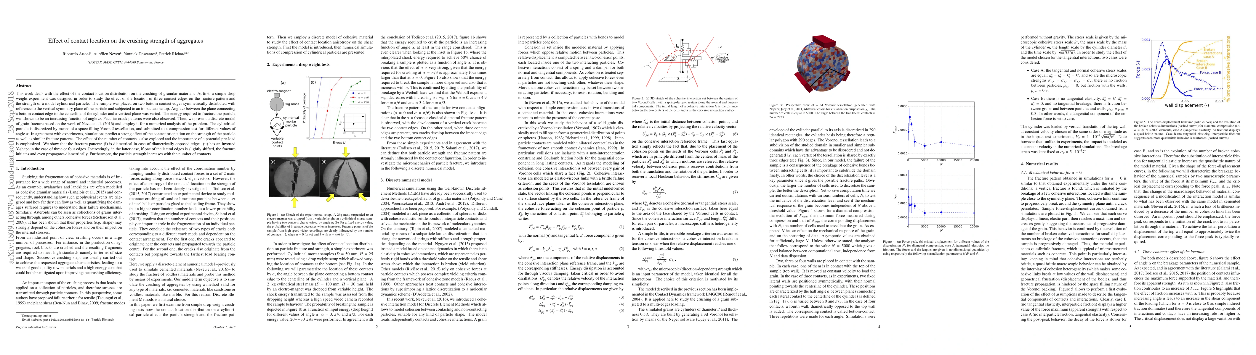 This work deals with the effect of the contact location distribution on the crushing of granular materials. At first, a simple drop weight experiment was designed in order to study the effect of the location of three contact edges on the fracture pattern and the strength of a model cylindrical particle. The sample was placed on two bottom contact edges symmetrically distributed with reference to the vertical symmetry plane of the particle and subjected to an impact at the top. Angle $\alpha$ between the plane connecting a bottom contact edge to the centerline of the cylinder and a vertical plane was varied. The energy required to fracture the particle was shown to be an increasing function of angle $\alpha$. Peculiar crack patterns were also observed. Then, we present a discrete model of grain fracture based on the work of Neveu et al. (2016) and employ it for a numerical analysis of the problem. The cylindrical particle is discretized by means of a space filling Vorono\"i tessellation, and submitted to a compression test for different values of angle $\alpha$. In agreement with experiments, simulations predict a strong effect of the contact orientation on the strength of the particle as well as similar fracture patterns. The effect of the number of contacts is also explored and the importance of a potential pre-load is emphasized. We show that the fracture pattern: (i) is diametrical in case of diametrically opposed edges, (ii) has an inverted Y-shape in the case of three or four edges. Interestingly, in the latter case, if one of the lateral edges is slightly shifted, the fracture initiates and even propagates diametrically. Furthermore, the particle strength increases with the number of contacts.