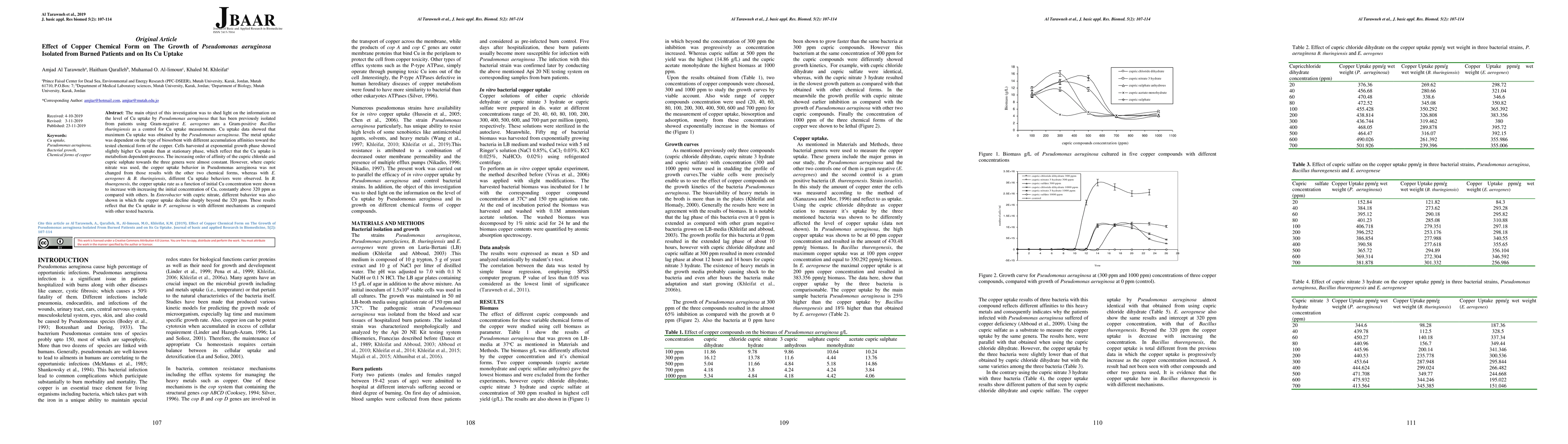 The main object of this investigation was to shed light on the information on the level of Cu uptake by Pseudomonas aeruginosa that has been previously isolated from patients using Gram-negative E. aerogenes ans a Gram-positive Bacillus thuringiensis as a control for Cu uptake measurements. Cu uptake data showed that maximum Cu uptake was obtained by the Pseudomonas aeruginosa. The metal uptake was dependent on the type of biosorbent with different accumulation affinities toward the tested chemical form of the copper. Cells harvested at exponential growth phase showed slightly higher Cu uptake than at stationary phase, which reflect that the Cu uptake is metabolism dependent-process. The increasing order of affinity of the cupric chloride and cupric sulphate towards the three genera were almost constant. However, where cupric nitrate was used, the copper uptake behavior in Pseudomonas aeroginosa was not changed from those results with the other two chemical forms, whereas with E. aerogenes & B. thuringiensis, different Cu uptake behaviors were observed. In B. thuengenesis, the copper uptake rate as a function of initial Cu concentration were shown to increase with increasing the initial concentration of Cu, constantly above 320 ppm as compared with others. In Enterobacter with cupric nitrate, different bahavior was also shown in which the copper uptake decline sharply beyond the 320 ppm. These results reflect that the Cu uptake in P. aeruginosa is with different mechanisms as compared with other tested bacteria.