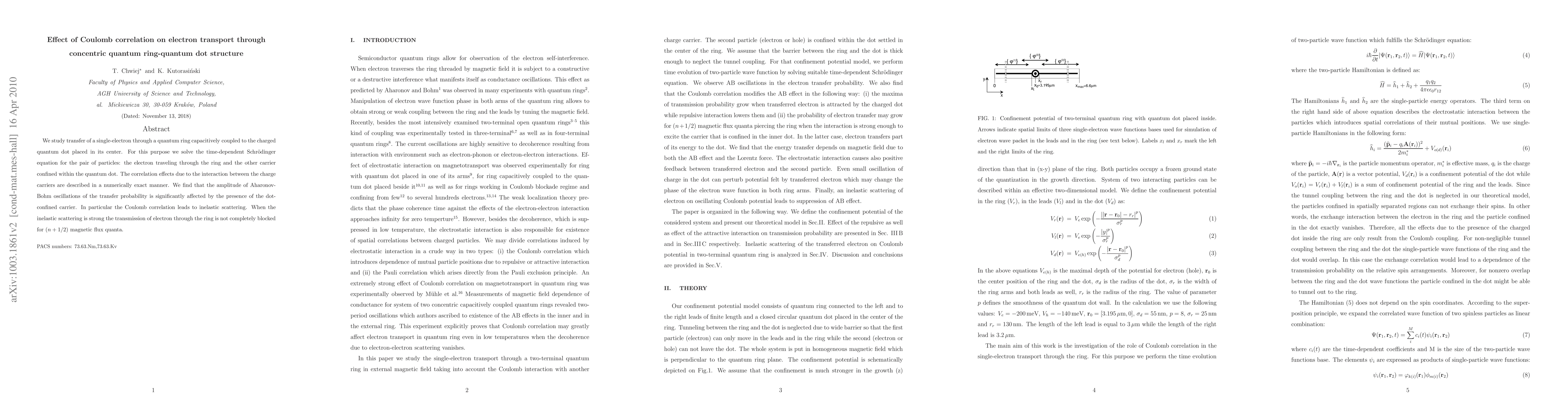 We theoretically study the single electron transfer through two-terminal quantum ring capacitively coupled to charged dot placed in its center. For this purpose we solve time-dependent Schrodinger equation for fully correlated two-particle system constituted by the transferred electron and the second particle confined in the dot. Analysis of transmission probability dependence on magnetic field in Ahronov-Bohm effect indicates that the maxima of transmission probability may be enhanced as well as reduced for attractive or repulsive Coulomb interaction respectively. The existence of Coulomb correlation in the system may also lead to inelastic scattering of the transferred electron. In such case, transmission of electron thorugh the ring is not completely blocked for (n+1/2) magnetic flux quanta.