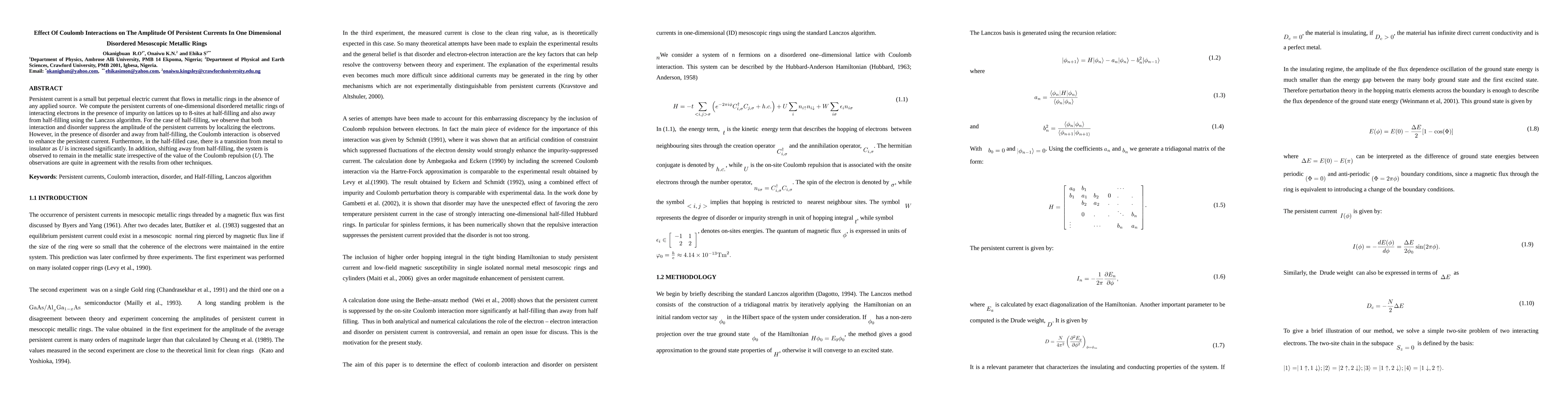 Persistent current is a small but perpetual electric current that flows in metallic rings in the absence of any applied source. We compute the persistent currents of one-dimensional disordered metallic rings of interacting electrons in the presence of impurity on lattices up to 8-sites at half-filling and also away from half-filling using the Lanczos algorithm. For the case of half-filling, we observe that both interaction and disorder suppress the amplitude of the persistent currents by localizing the electrons. However, in the presence of disorder and away from half-filling, the Coulomb interaction is observed to enhance the persistent current. Furthermore, in the half-filled case, there is a transition from metal to insulator as U is increased significantly. In addition, shifting away from half-filling, the system is observed to remain in the metallic state irrespective of the value of the Coulomb repulsion (U). The observations are quite in agreement with the results from other techniques.