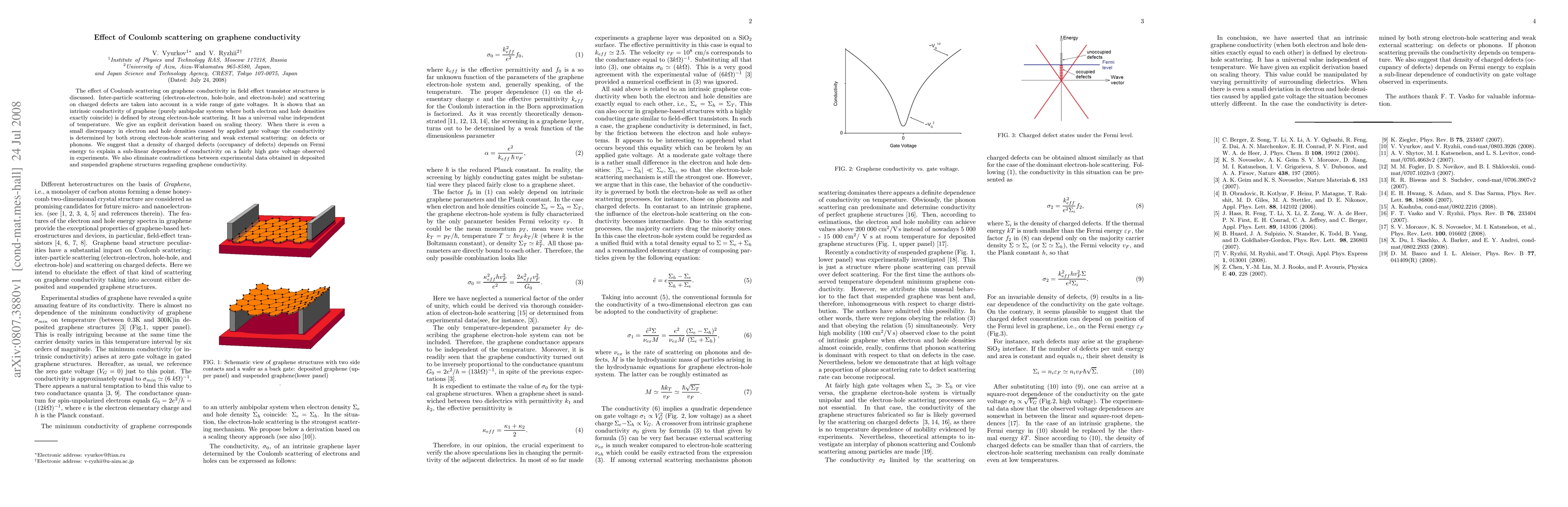 This paper investigates the influence of Coulomb scattering on graphene's conductivity in field effect transistors, revealing that intrinsic conductivity is primarily determined by strong electron-hole scattering. It explains discrepancies in experimental data by suggesting a Fermi energy-dependent density of charged defects.