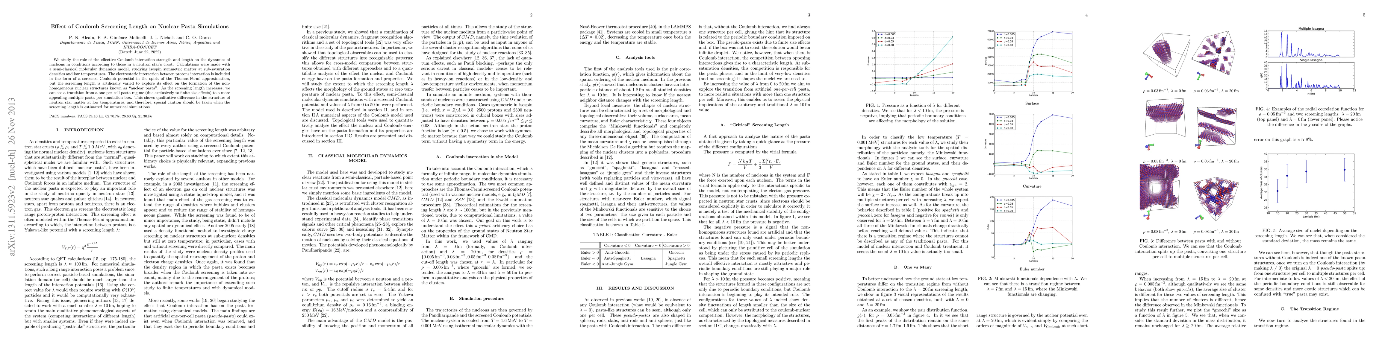 We study the role of the effective Coulomb interaction strength and length on the dynamics of nucleons in conditions according to those in a neutron star's crust. Calculations were made with a semi-classical molecular dynamics model, studying isospin symmetric matter at sub-saturation densities and low temperatures. The electrostatic interaction between protons interaction is included in the form of a screened Coulomb potential in the spirit of the Thomas-Fermi approximation, but the screening length is artificially varied to explore its effect on the formation of the non-homogeneous nuclear structures known as "nuclear pasta". As the screening length increases, we can a transition from a one-per-cell pasta regime (due exclusively to finite size effects) to a more appealing multiple pasta per simulation box. This shows qualitative difference in the structure of neutron star matter at low temperatures, and therefore, special caution should be taken when the screening length is estimated for numerical simulations.