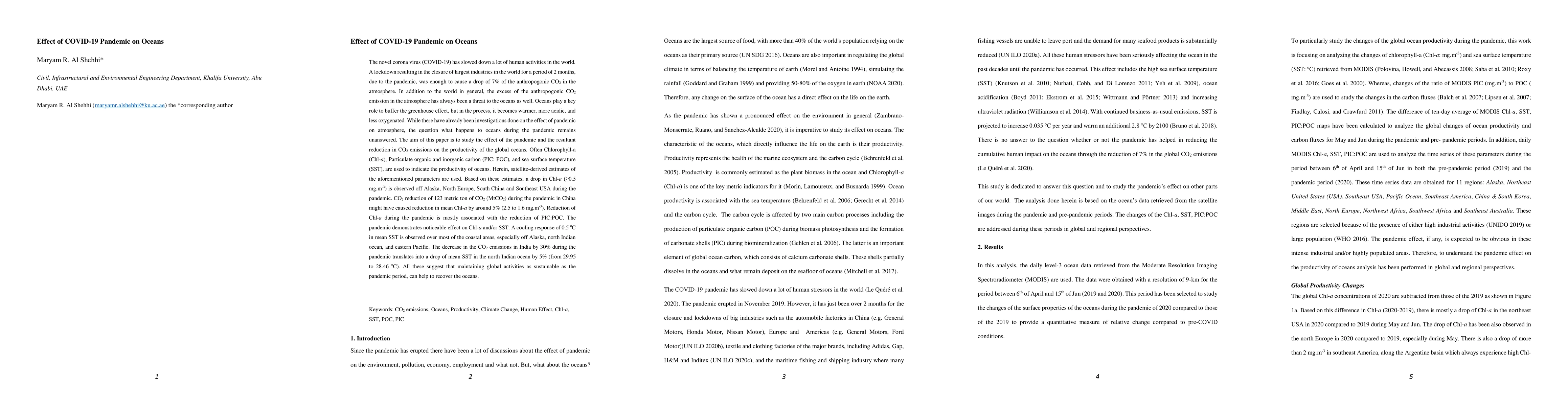 The COVID-19 pandemic led to a 7% reduction in atmospheric CO2, benefiting oceans, which became warmer, more acidic, and less oxygenated; satellite data showed significant drops in ocean productivity and sea surface temperature.