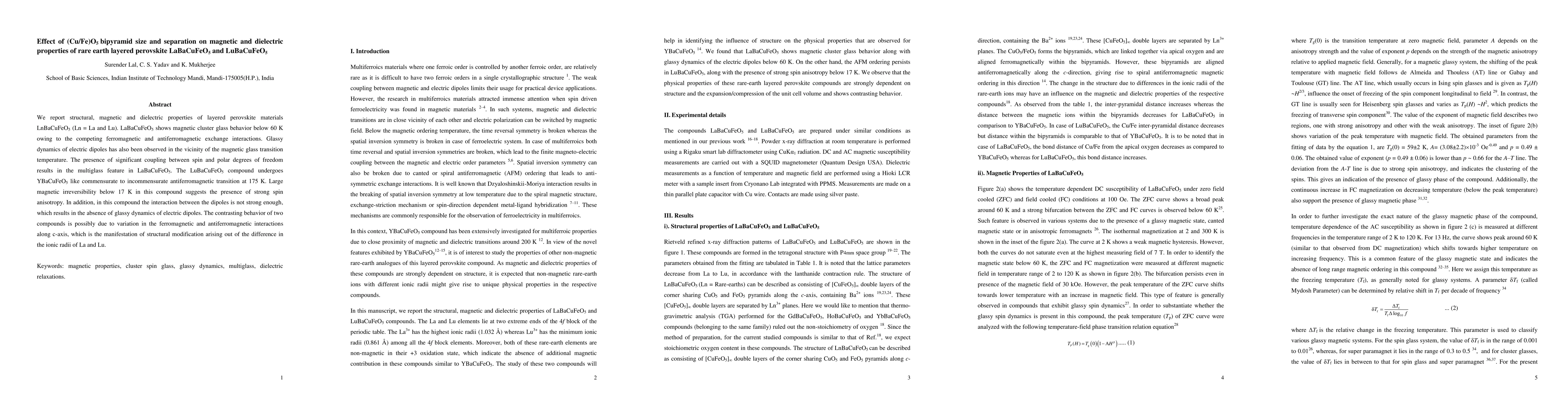 This study investigates the magnetic and dielectric properties of rare earth layered perovskites LaBaCuFeO5 and LuBaCuFeO5, revealing distinct behaviors: LaBaCuFeO5 exhibits magnetic cluster glass behavior and multiglass features, while LuBaCuFeO5 shows an antiferromagnetic transition and strong spin anisotropy without dielectric glassy dynamics. The differences are attributed to structural modifications due to ionic radii variations.