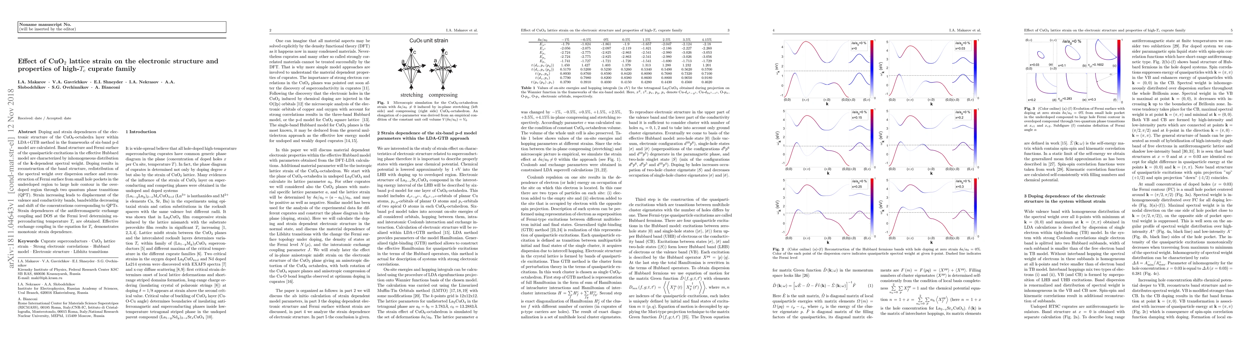 Doping and strain dependences of the electronic structure of the CuO6-octahedra layer within LDA+GTB method in the frameworks of six-band p-d model are calculated. Band structure and Fermi surface of the quasiparticle excitations in the effective Hubbard model are characterized by inhomogeneous distribution of the k-dependent spectral weight. Doping results in reconstruction of the band structure, redistribution of the spectral weight over dispersion surface and reconstruction of Fermi surface from small hole pockets in the underdoped region to large hole contour in the overdoped region through two quantum phase transitions (QPT). Strain increasing leads to displacement of the valence and conductivity bands, bandwidths decreasing and shift of the concentrations corresponding to QPTs. Strain dependences of the antiferromagnetic exchange coupling and DOS at the Fermi level determining superconducting temperature Tc are obtained. Effective exchange coupling in the equation for Tc demonstrates monotonic strain dependence.