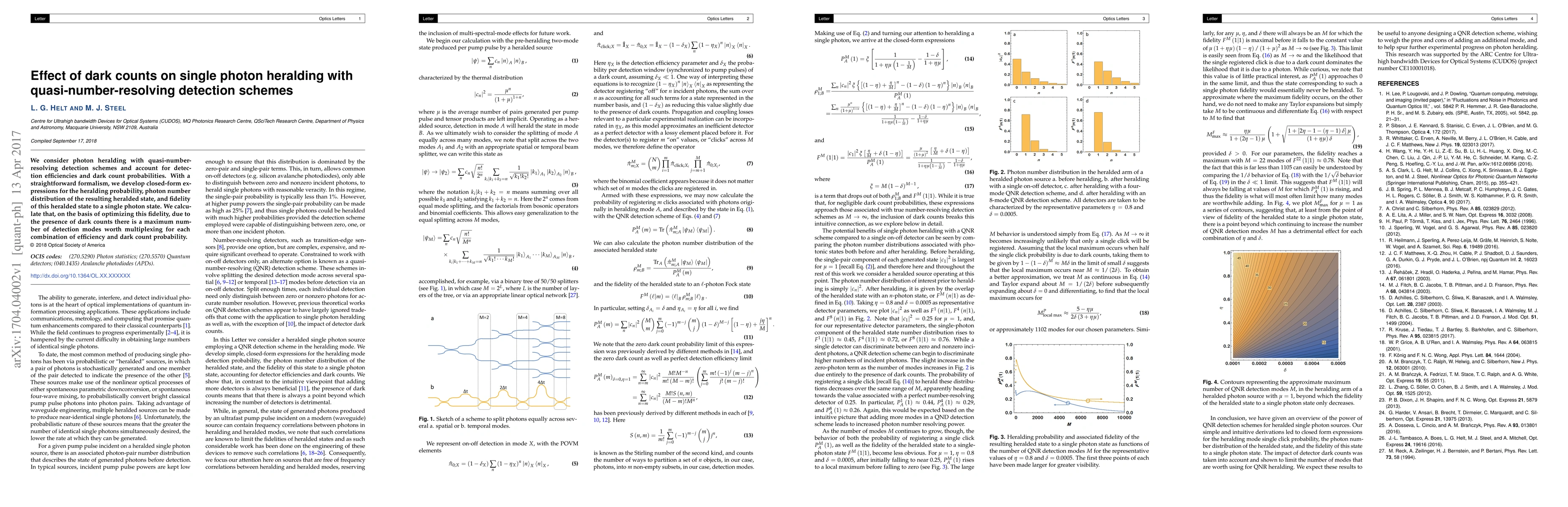This paper investigates the impact of dark counts on single photon heralding using quasi-number-resolving detection schemes, deriving expressions for heralding probability and fidelity. It concludes that there is an optimal number of detection modes to multiplex, maximizing fidelity despite the presence of dark counts.