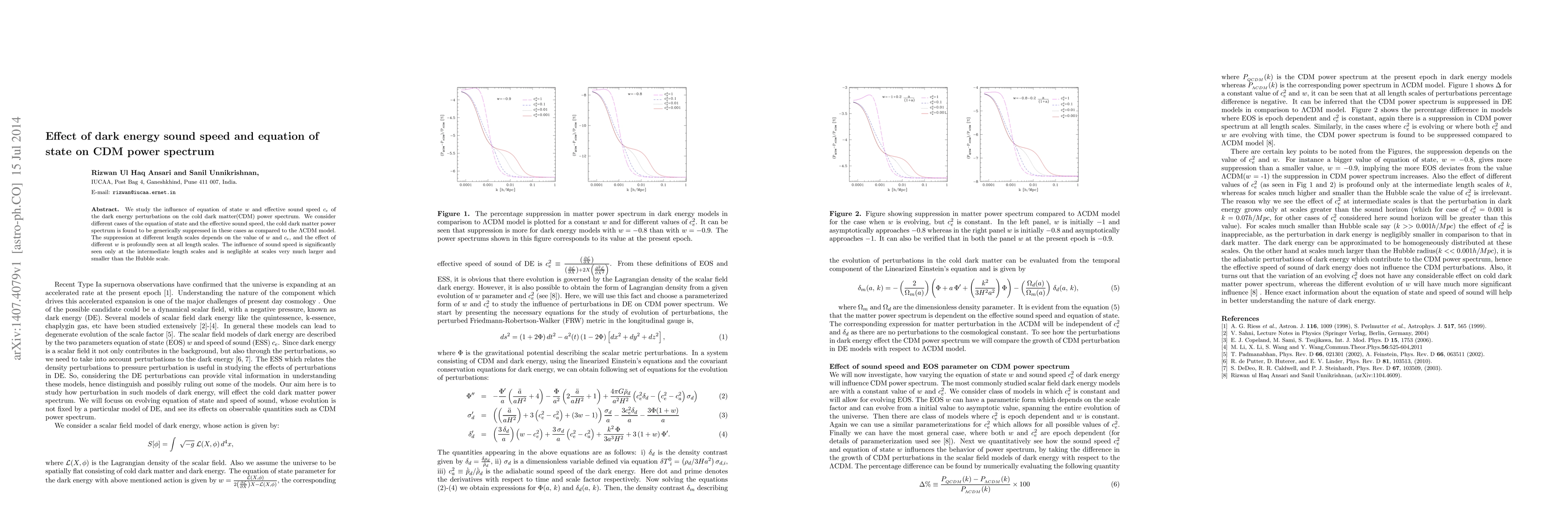 We study the influence of equation of state $w$ and effective sound speed $c_e$ of the dark energy perturbations on the cold dark matter(CDM) power spectrum.We consider different cases of the equation of state and the effective sound speed, the cold dark matter power spectrum is found to be generically suppressed in these cases as compared to the $\Lambda$CDM model. The suppression at different length scales depends on the value of $w$ and $c_e$, and the effect of different $w$ is profoundly seen at all length scales. The influence of sound speed is significantly seen only at the intermediate length scales and is negligible at scales very much larger and smaller than the Hubble scale.