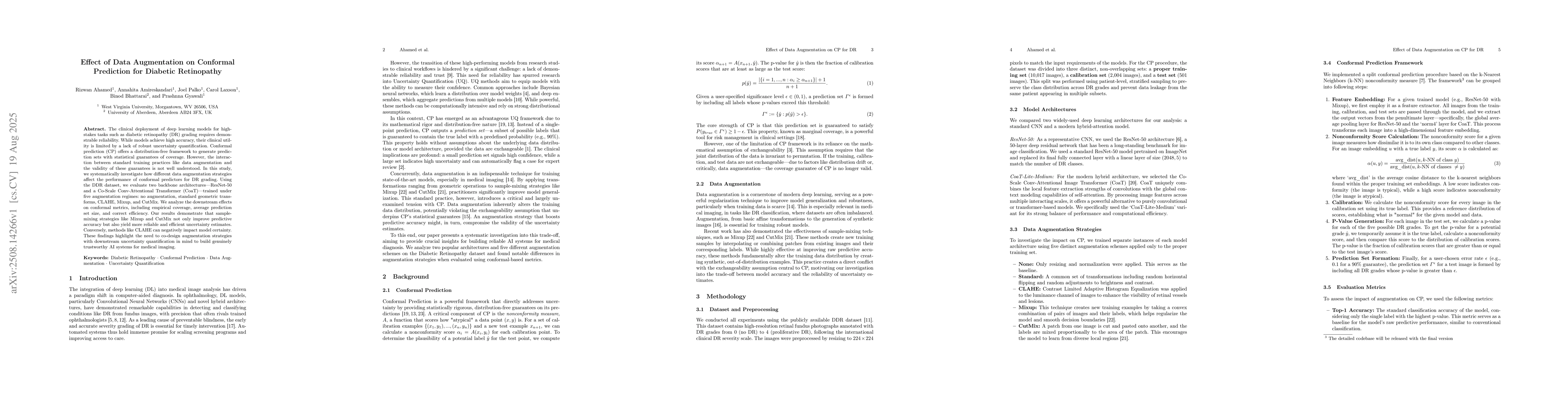 The clinical deployment of deep learning models for high-stakes tasks such as diabetic retinopathy (DR) grading requires demonstrable reliability. While models achieve high accuracy, their clinical utility is limited by a lack of robust uncertainty quantification. Conformal prediction (CP) offers a distribution-free framework to generate prediction sets with statistical guarantees of coverage. However, the interaction between standard training practices like data augmentation and the validity of these guarantees is not well understood. In this study, we systematically investigate how different data augmentation strategies affect the performance of conformal predictors for DR grading. Using the DDR dataset, we evaluate two backbone architectures -- ResNet-50 and a Co-Scale Conv-Attentional Transformer (CoaT) -- trained under five augmentation regimes: no augmentation, standard geometric transforms, CLAHE, Mixup, and CutMix. We analyze the downstream effects on conformal metrics, including empirical coverage, average prediction set size, and correct efficiency. Our results demonstrate that sample-mixing strategies like Mixup and CutMix not only improve predictive accuracy but also yield more reliable and efficient uncertainty estimates. Conversely, methods like CLAHE can negatively impact model certainty. These findings highlight the need to co-design augmentation strategies with downstream uncertainty quantification in mind to build genuinely trustworthy AI systems for medical imaging.