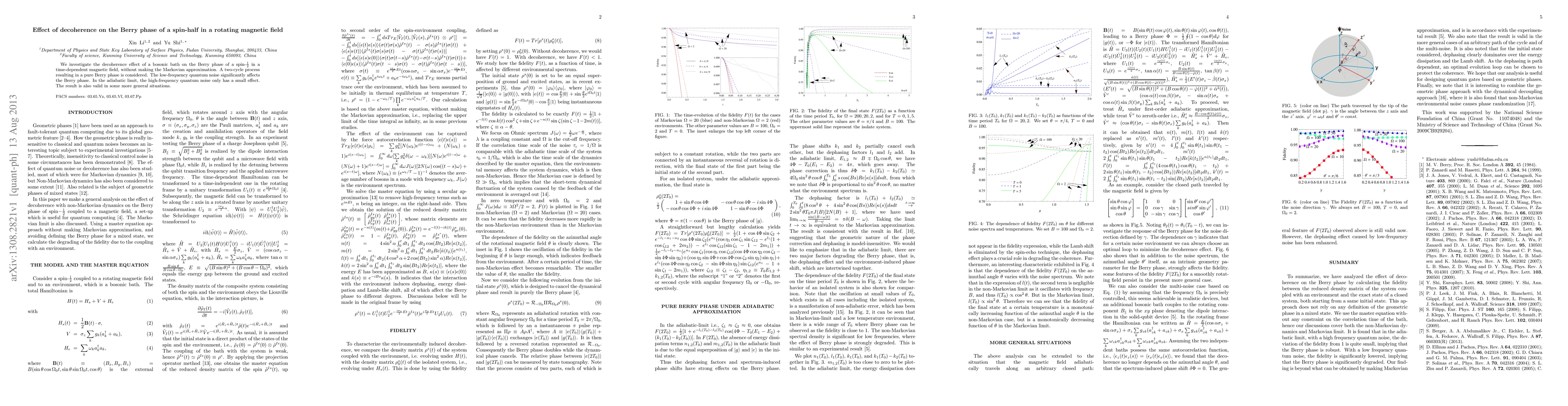 Research investigates how decoherence from a bosonic bath affects the Berry phase of a spin-1/2 in a rotating magnetic field, finding that low-frequency noise significantly impacts it. The effect is more pronounced than previously thought.