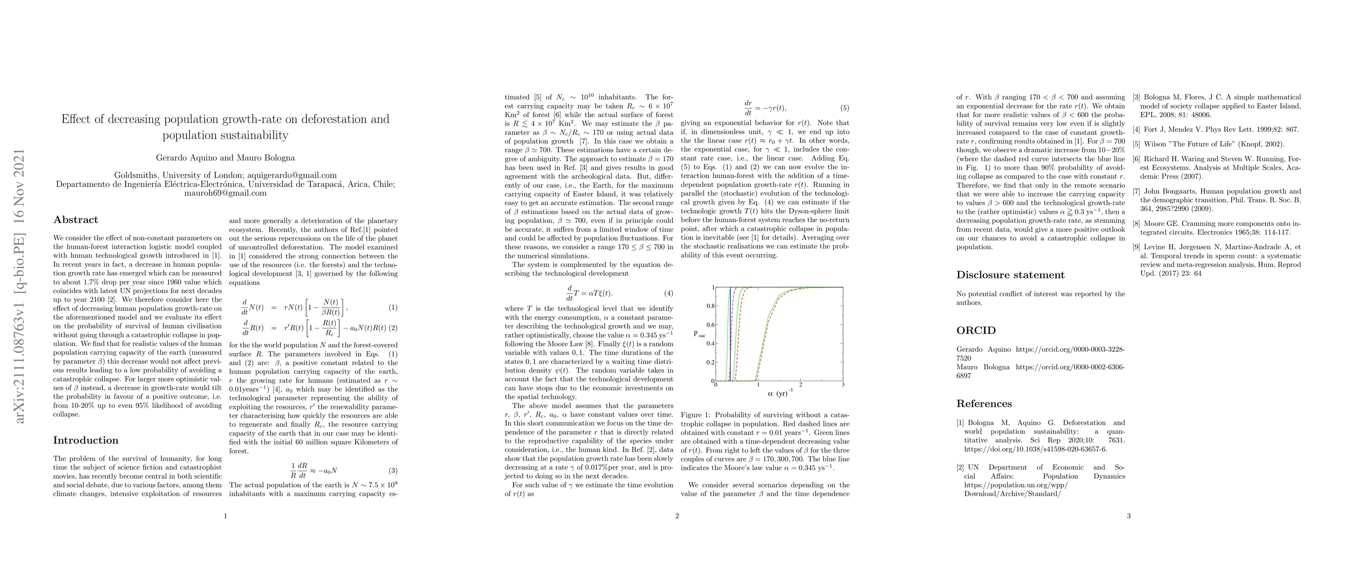 We consider the effect of non-constant parameters on the human-forest interaction logistic model coupled with human technological growth introduced in "Deforestation and world population sustainability: a quantitative analysis"[1]. In recent years in fact, a decrease in human population growth rate has emerged which can be measured to about 1.7% drop per year since 1960 value which coincides with latest UN projections for next decades up to year 2100 [2]. We therefore consider here the effect of decreasing human population growth-rate on the aforementioned model and we evaluate its effect on the probability of survival of human civilisation without going through a catastrophic collapse in population. We find that for realistic values of the human population carrying capacity of the earth (measured by parameter beta) this decrease would not affect previous results leading to a low probability of avoiding a catastrophic collapse. For larger more optimistic values of beta instead, a decrease in growth-rate would tilt the probability in favour of a positive outcome, i.e. from 10-20% up to even 95% likelihood of avoiding collapse.