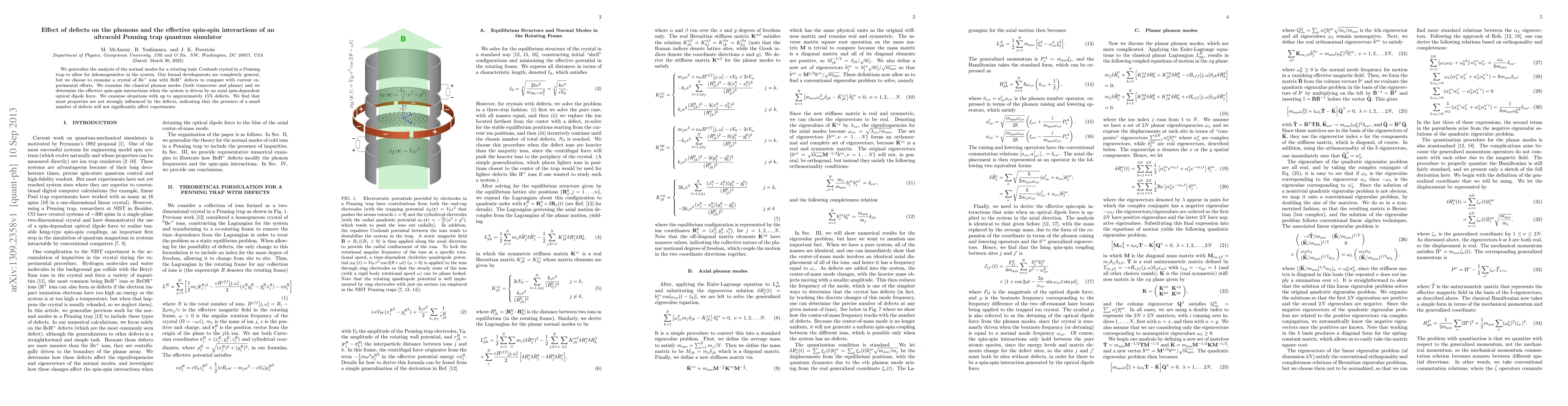 This paper generalizes the analysis of phonon modes in a rotating ionic Coulomb crystal with defects in a Penning trap, focusing on Be+ ions with BeH+ defects. It finds that even with up to 15% defects, the effects on phonons and effective spin-spin interactions remain minimal, suggesting that minor imperfections do not significantly impact experimental results.