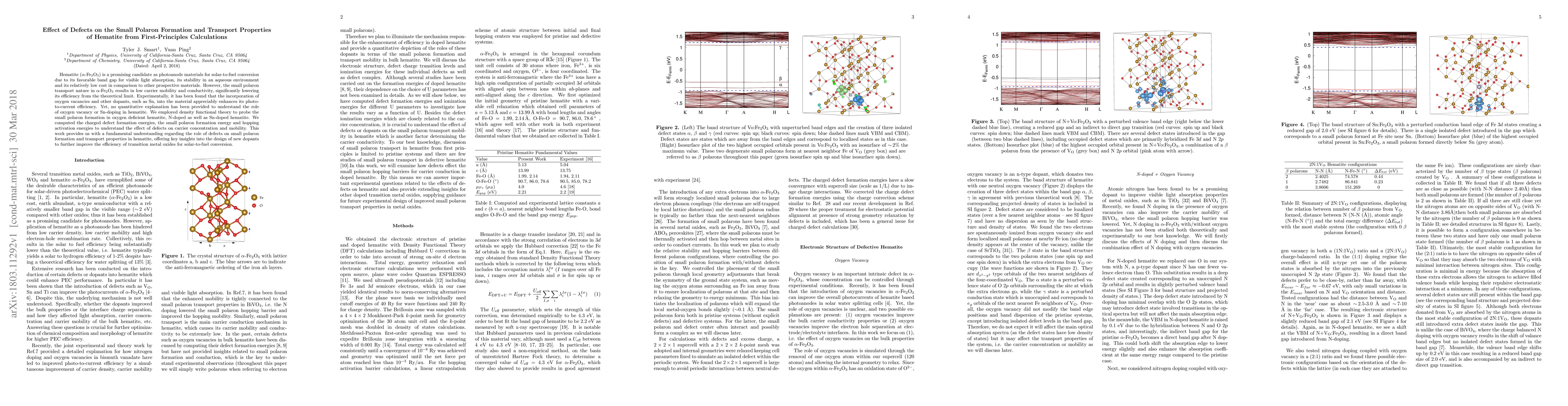 This study uses first-principles calculations to investigate how oxygen vacancies and Sn-doping affect small polaron formation and transport in hematite, revealing that defects enhance carrier mobility and efficiency for solar-to-fuel conversion. The findings provide insights into optimizing dopants for improved performance in photoanode materials.