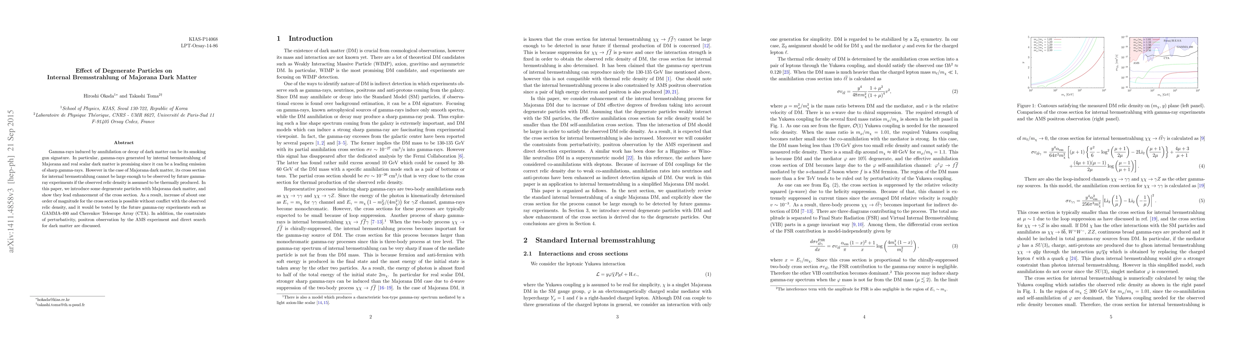 Gamma-rays induced by annihilation or decay of dark matter can be its smoking gun signature. In particular, gamma-rays generated by internal bremsstrahlung of Majorana and real scalar dark matter is promising since it can be a leading emission of sharp gamma-rays. However in the case of Majorana dark matter, its cross section for internal bremsstrahlung cannot be large enough to be observed by future gamma-ray experiments if the observed relic density is assumed to be thermally produced. In this paper, we introduce some degenerate particles with Majorana dark matter, and show they lead enhancement of the cross section. As a result, increase of about one order of magnitude for the cross section is possible without conflict with the observed relic density, and it would be tested by the future gamma-ray experiments such as GAMMA-400 and Cherenkov Telescope Array (CTA). In addition, the constraints of perturbativity, positron observation by the AMS experiment and direct search for dark matter are discussed.