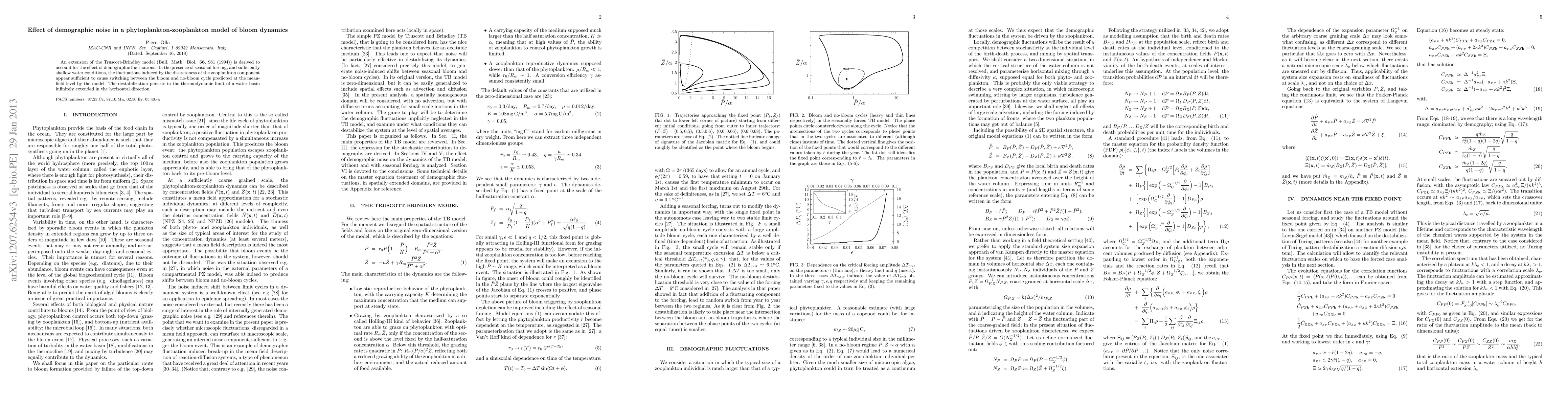 This paper extends the Truscott-Brindley model to incorporate demographic noise, showing that fluctuations in zooplankton can cause switching between bloom and no-bloom cycles under seasonal forcing and shallow water conditions, even in large, horizontally extended water basins. The destabilization effect persists even in the thermodynamic limit.