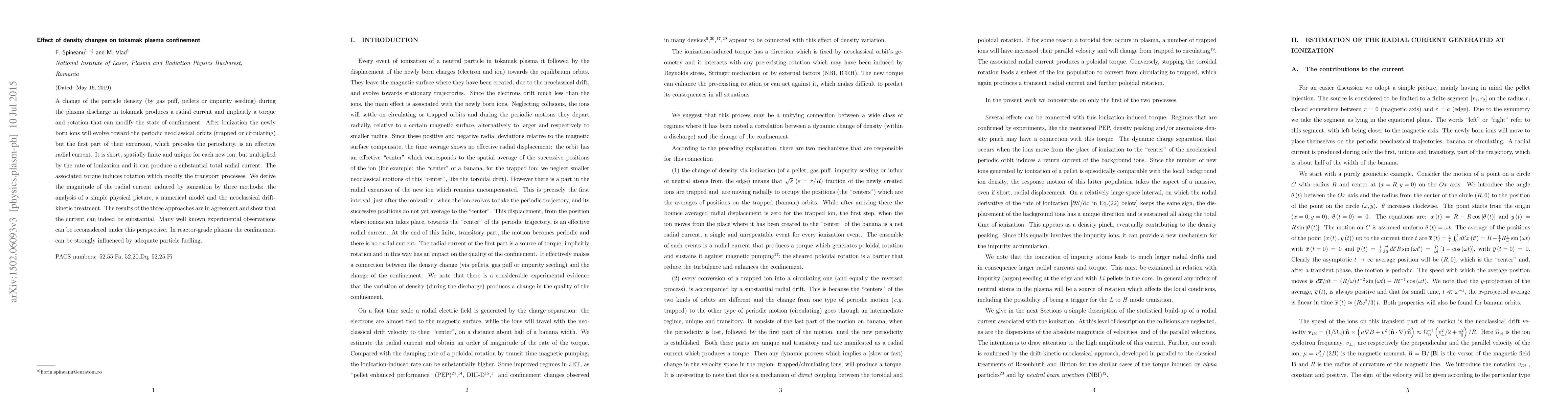 A change of the particle density (by gas puff, pellets or impurity seeding) during the plasma discharge in tokamak produces a radial current and implicitly a torque and rotation that can modify the state of confinement. After ionization the newly born ions will evolve toward the periodic neoclassical orbits (trapped or circulating) but the first part of their excursion, which precedes the periodicity, is an effective radial current. It is short, spatially finite and unique for each new ion, but multiplied by the rate of ionization and it can produce a substantial total radial current. The associated torque induces rotation which modify the transport processes. We derive the magnitude of the radial current induced by ionization by three methods: the analysis of a simple physical picture, a numerical model and the neoclassical drift-kinetic treatment. The results of the three approaches are in agreement and show that the current can indeed be substantial. Many well known experimental observations can be reconsidered under this perspective. In reactor-grade plasma the confinement can be strongly influenced by adequate particle fuelling.
