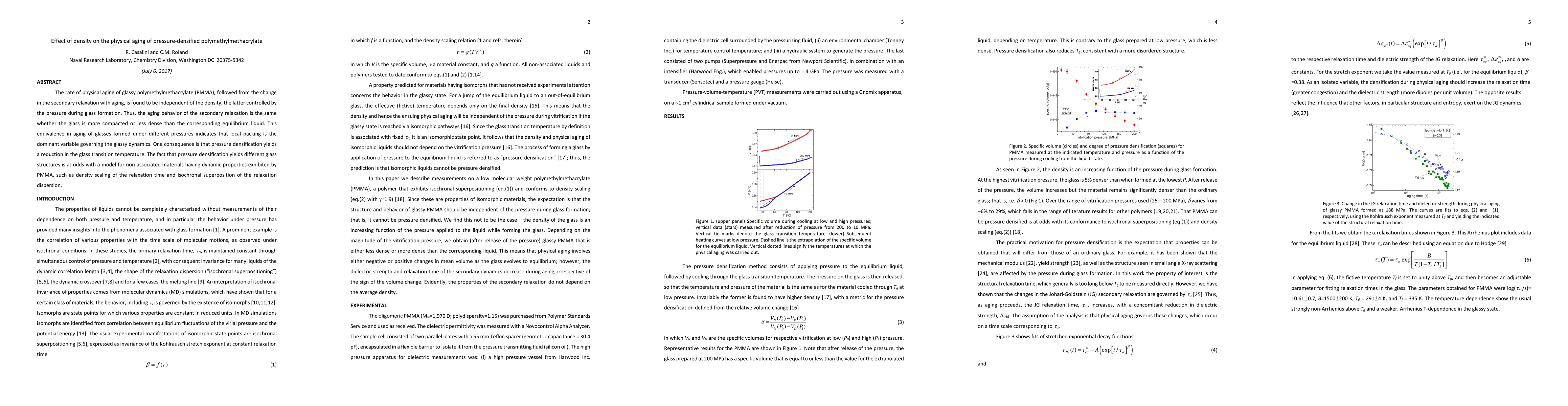 The rate of physical aging of glassy polymethylmethacrylate (PMMA), followed from the change in the secondary relaxation with aging, is found to be independent of the density, the latter controlled by the pressure during glass formation. Thus, the aging behavior of the secondary relaxation is the same whether the glass is more compacted or less dense than the corresponding equilibrium liquid. This equivalence in aging of glasses formed under different pressures indicates that local packing is the dominant variable governing the glassy dynamics. One consequence is that pressure densification yields a reduction in the glass transition temperature. The fact that pressure densification yields different glass structures is at odds with a model for non-associated materials having dynamic properties exhibited by PMMA, such as density scaling of the relaxation time and isochronal superposition of the relaxation dispersion.