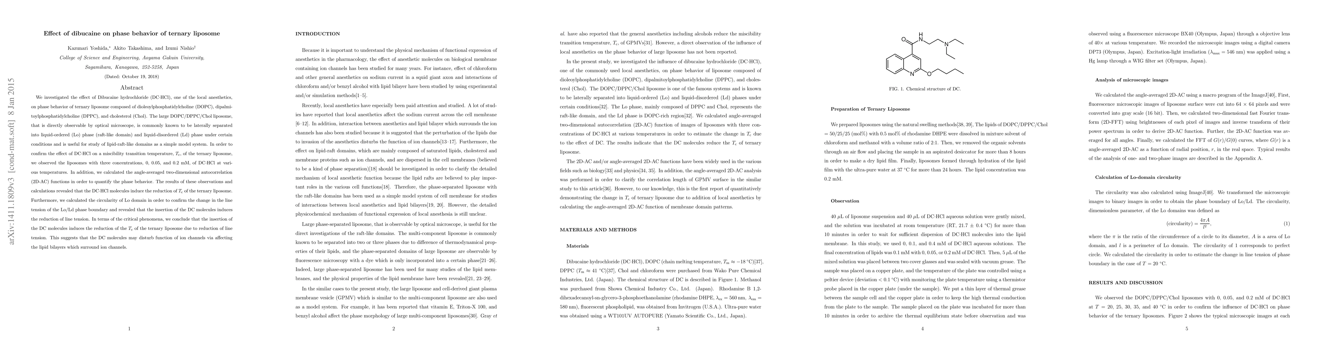 We investigated the effect of Dibucaine hydrochloride (DC$\cdot$HCl), one of the local anesthetics, on phase behavior of ternary liposome composed of dioleoylphosphatidylcholine (DOPC), dipalmitoylphosphatidylcholine (DPPC), and cholesterol (Chol). The large DOPC/DPPC/Chol liposome, that is directly observable by optical microscope, is commonly known to be laterally separated into liquid-ordered (Lo) phase (raft-like domain) and liquid-disordered (Ld) phase under certain conditions and is useful for study of lipid-raft-like domains as a simple model system. In order to confirm the effect of DC$\cdot$HCl on a miscibility transition temperature, $T_{\rm c}$, of the ternary liposome, we observed the liposomes with three concentrations, 0, 0.05, and 0.2~mM, of DC$\cdot$HCl at various temperatures. In addition, we calculated the angle-averaged two-dimensional autocorrelation (2D-AC) functions in order to quantify the phase behavior. The results of these observations and calculations revealed that the DC$\cdot$HCl molecules induce the reduction of $T_{\rm c}$ of the ternary liposome. Furthermore, we calculated the circularity of Lo domain in order to confirm the change in the line tension of the Lo/Ld phase boundary and revealed that the insertion of the DC molecules induces the reduction of line tension. In terms of the critical phenomena, we conclude that the insertion of the DC molecules induces the reduction of the $T_{\rm c}$ of the ternary liposome due to reduction of line tension. This suggests that the DC molecules may disturb function of ion channels via affecting the lipid bilayers which surround ion channels.
