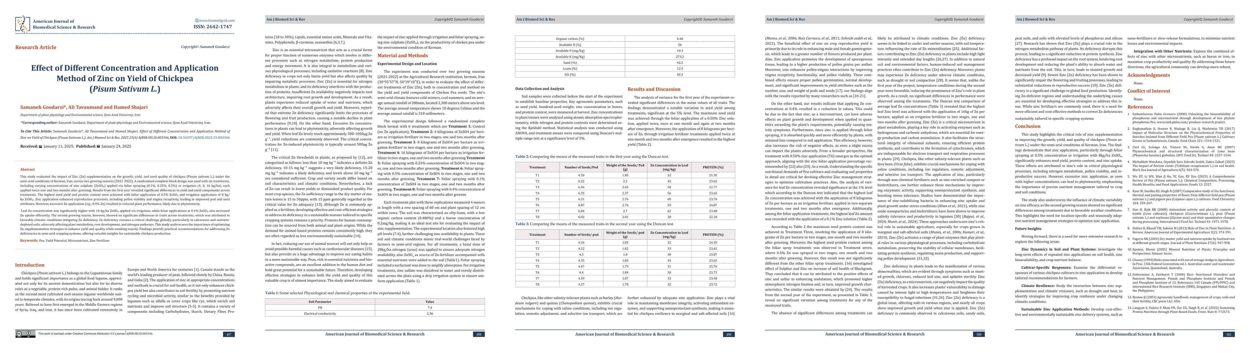 This study evaluated the impact of Zinc (Zn) supplementation on the growth, yield, and seed quality of chickpea (Pisum sativum L.) under the semi-arid conditions of Kerman, Iran, across two growing seasons (2021-2022). A randomized complete block design was used with six treatments, including varying concentrations of zinc sulphate applied via foliar spraying (0.1%, 0.25%, 0.5%) or irrigation (4, 8, 16 kg/ha), each applied twice-one and two months after greening. Results from the first year revealed significant differences in yield and yield components across treatments. The highest seed yield and protein content were achieved with foliar application of 0.5% and irrigation application of 8 kg/ . Zinc application enhanced reproductive processes, including pollen viability and stigma receptivity, leading to improved pod and seed attributes. However, excessive Zn application (e.g., 0.4% Zn) resulted in reduced plant performance, likely due to phytotoxicity. Leaf Zn concentration was significantly higher with 16 kg/ha applied via irrigation, while foliar applications at 0.1% also increased Zn uptake efficiently. The second growing season, however, showed no significant differences in traits across treatments, which was attributed to favorable climatic conditions mitigating Zn deficiency. Zn deficiency remains a critical challenge globally, particularly in calcareous and nutrient depleted soils, adversely affecting plant metabolism, root development, and nitrogen pathways. This study underscores the importance of optimizing Zn supplementation strategies to enhance yield and quality while avoiding toxicity. Findings provide practical recommendations for addressing Zn deficiencies in semi-arid cropping systems, offering valuable insights for sustainable chickpea production