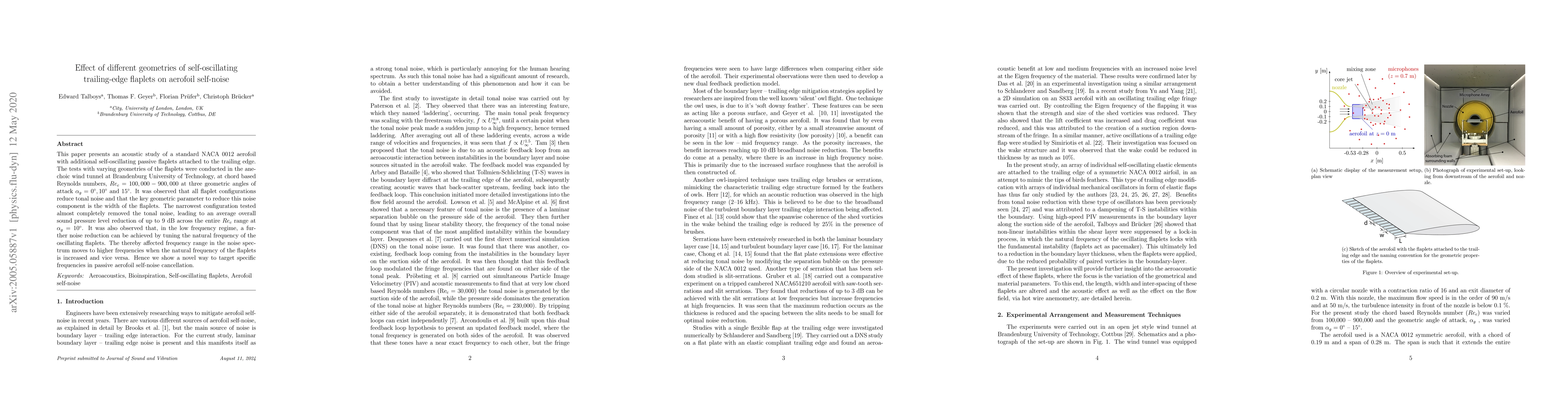 This study investigates the impact of various trailing-edge flaplet geometries on the self-noise of a NACA 0012 aerofoil, finding that narrow flaplets significantly reduce tonal noise by up to 9 dB. Additionally, tuning the flaplets' natural frequency shifts the affected noise frequency range, offering a method to target specific noise frequencies.