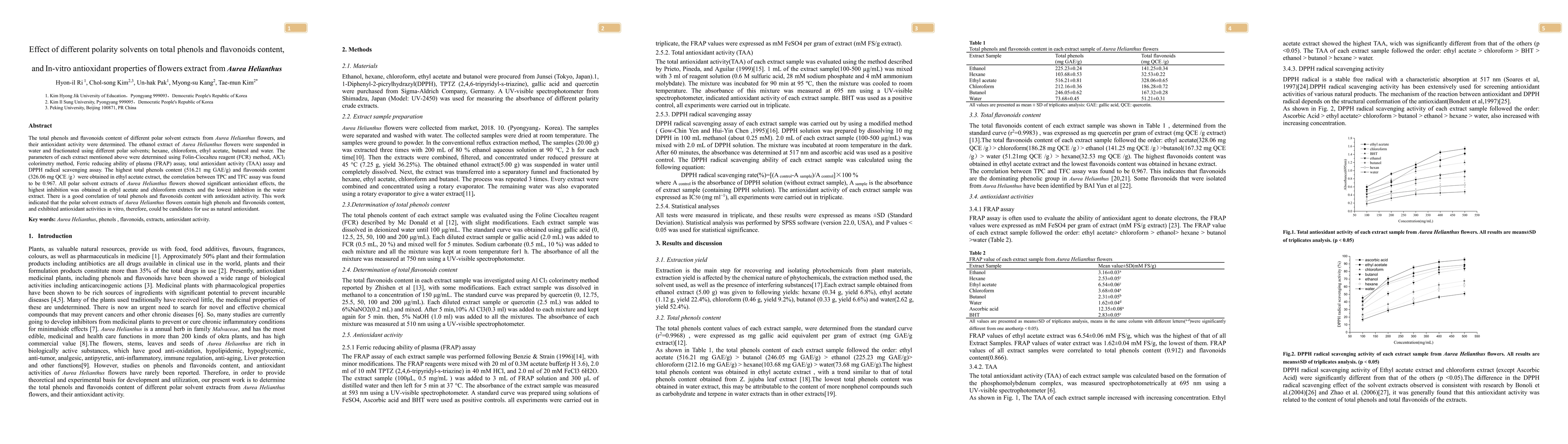 The total phenols and flavonoids content of different polar solvent extracts from Aurea Helianthus flowers, and their antioxidant activity were determined. The ethanol extract of Aurea Helianthus flowers were suspended in water and fractionated using different polar solvents; hexane, chloroform, ethyl acetate, butanol and water. The parameters of each extract mentioned above were determined using Floin-ciocalteu reagent(FCR) method, AlCl3 colorimetry method, ferric reducing ability of plasma(FRAP) assay, total antioxidant activity(TAA) assay and DPPH radical scavenging assay. The highest total phenols content(516.21 mg GAE/g) and flavonoids content(326.06 mg QCE/g) were obtained in ethyl acetate extract, the correlation between TPC and TFC assay was founded to be 0.967. All polar solvent extracts of Aurea Helianthus flowers showed significant antioxidant effects, the hightest inhibition was obtained in ethyl acetate and choroform extracts and the lowest inhibition in the water extract. There is a good correlation of total phenols and flavonoids content with antioxidant activity. This work indicated that the polar solvent extracts of Aurea Helianthus flowers contain high phenols and flavonoids content and exhibited antioxidant activities in vitro, therefore, could be candidates for use as natural antioxidant.