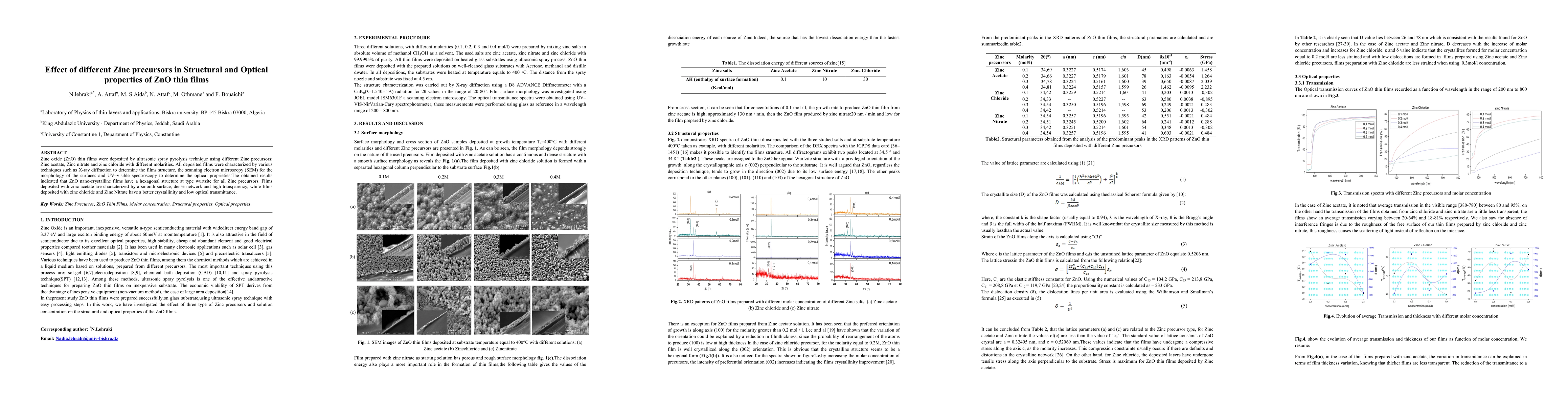 Zinc oxide thin films were deposited by ultrasonic spray pyrolysis technique using different Zinc precursors: Zinc acetate, Zinc nitrate and zinc chloride with different molarities. All deposited films were characterized by various techniques such as X-ray diffraction to determine the films structure, the scanning electron microscopy SEM for the morphology of the surfaces and UV visible spectroscopy to determine the optical proprieties.The obtained results indicated that ZnO nano-crystalline films have a hexagonal structure at type wurtzite for all Zinc precursors. Films deposited with zinc acetate are characterized by a smooth surface, dense network and high transparency, while films deposited with zinc chloride and Zinc Nitrate have a better crystallinity and low optical transmittance.