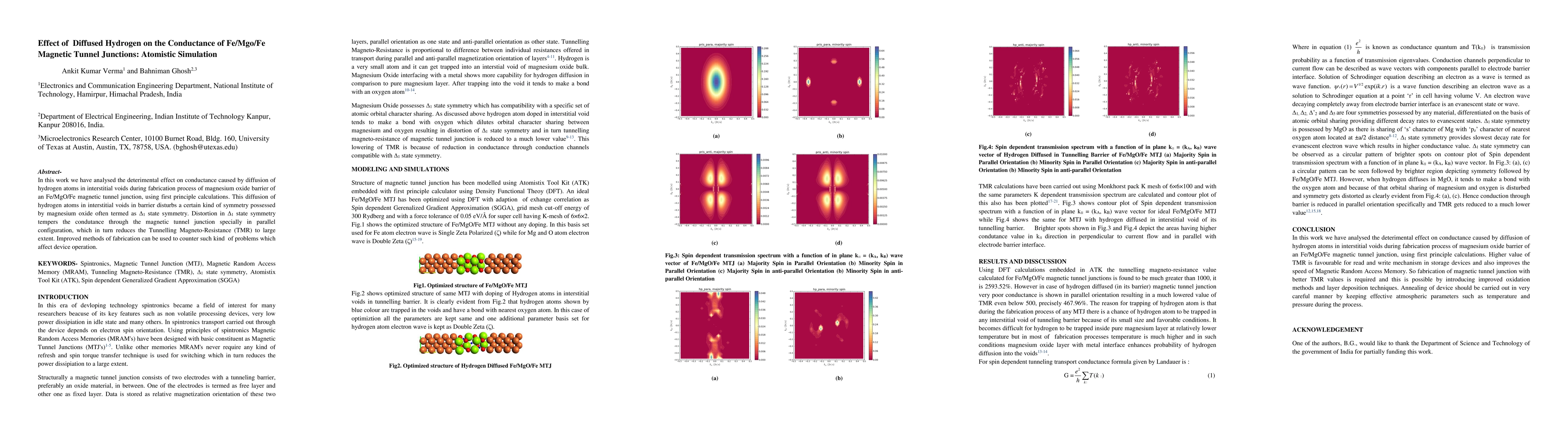 In this work we have analysed the deterimental effect on conductance caused by diffusion of hydrogen atoms in interstitial voids during fabrication process of magnesium oxide barrier of an Fe MgO Fe magnetic tunnel junction, using first principle calculations. This diffusion of hydrogen atoms in interstitial voids in barrier disturbs a certain kind of symmetry possessed by magnesium oxide often termed as delta 1 state symmetry. Distortion in delta 1 state symmetry tempers the condutance through the magnetic tunnel junction specially in parallel configuration, which in turn reduces the Tunnelling Magneto Resistance TMR to large extent. Improved methods of fabrication can be used to counter such kind of problems which affect device operation.