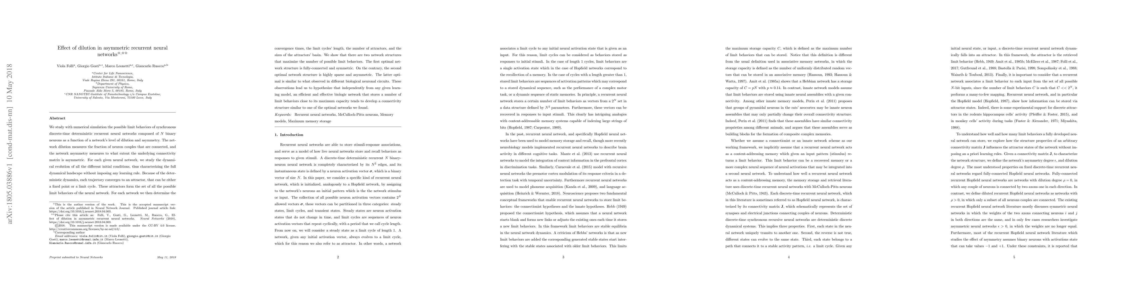 We study with numerical simulation the possible limit behaviors of synchronous discrete-time deterministic recurrent neural networks composed of N binary neurons as a function of a network's level of dilution and asymmetry. The network dilution measures the fraction of neuron couples that are connected, and the network asymmetry measures to what extent the underlying connectivity matrix is asymmetric. For each given neural network, we study the dynamical evolution of all the different initial conditions, thus characterizing the full dynamical landscape without imposing any learning rule. Because of the deterministic dynamics, each trajectory converges to an attractor, that can be either a fixed point or a limit cycle. These attractors form the set of all the possible limit behaviors of the neural network. For each network, we then determine the convergence times, the limit cycles' length, the number of attractors, and the sizes of the attractors' basin. We show that there are two network structures that maximize the number of possible limit behaviors. The first optimal network structure is fully-connected and symmetric. On the contrary, the second optimal network structure is highly sparse and asymmetric. The latter optimal is similar to what observed in different biological neuronal circuits. These observations lead us to hypothesize that independently from any given learning model, an efficient and effective biologic network that stores a number of limit behaviors close to its maximum capacity tends to develop a connectivity structure similar to one of the optimal networks we found.