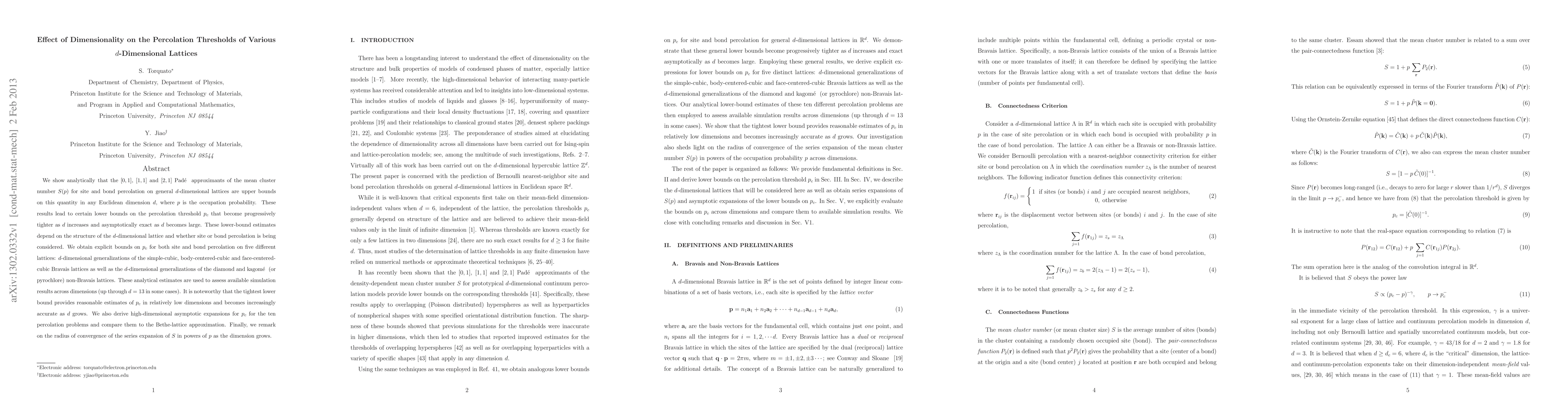We show analytically that the $[0,1]$, $[1,1]$ and $[2,1]$ Pad{\'e} approximants of the mean cluster number $S(p)$ for site and bond percolation on general $d$-dimensional lattices are upper bounds on this quantity in any Euclidean dimension $d$, where $p$ is the occupation probability. These results lead to certain lower bounds on the percolation threshold $p_c$ that become progressively tighter as $d$ increases and asymptotically exact as $d$ becomes large. These lower-bound estimates depend on the structure of the $d$-dimensional lattice and whether site or bond percolation is being considered. We obtain explicit bounds on $p_c$ for both site and bond percolation on five different lattices: $d$-dimensional generalizations of the simple-cubic, body-centered-cubic and face-centered-cubic Bravais lattices as well as the $d$-dimensional generalizations of the diamond and kagom{\'e} (or pyrochlore) non-Bravais lattices. These analytical estimates are used to assess available simulation results across dimensions (up through $d=13$ in some cases). It is noteworthy that the tightest lower bound provides reasonable estimates of $p_c$ in relatively low dimensions and becomes increasingly accurate as $d$ grows. We also derive high-dimensional asymptotic expansions for $p_c$ for the ten percolation problems and compare them to the Bethe-lattice approximation. Finally, we remark on the radius of convergence of the series expansion of $S$ in powers of $p$ as the dimension grows.