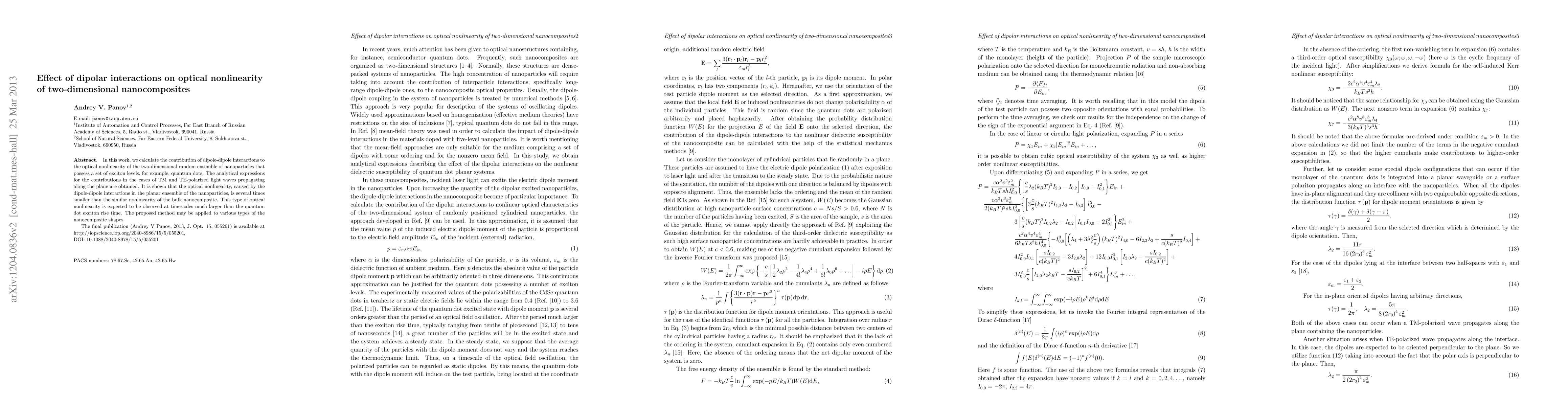 In this work, we calculate the contribution of dipole-dipole interactions to the optical nonlinearity of the two-dimensional random ensemble of nanoparticles that possess a set of exciton levels, for example, quantum dots. The analytical expressions for the contributions in the cases of TM and TE-polarized light waves propagating along the plane are obtained. It is shown that the optical nonlinearity, caused by the dipole-dipole interactions in the planar ensemble of the nanoparticles, is several times smaller than the similar nonlinearity of the bulk nanocomposite. This type of optical nonlinearity is expected to be observed at timescales much larger than the quantum dot exciton rise time. The proposed method may be applied to various types of the nanocomposite shapes.