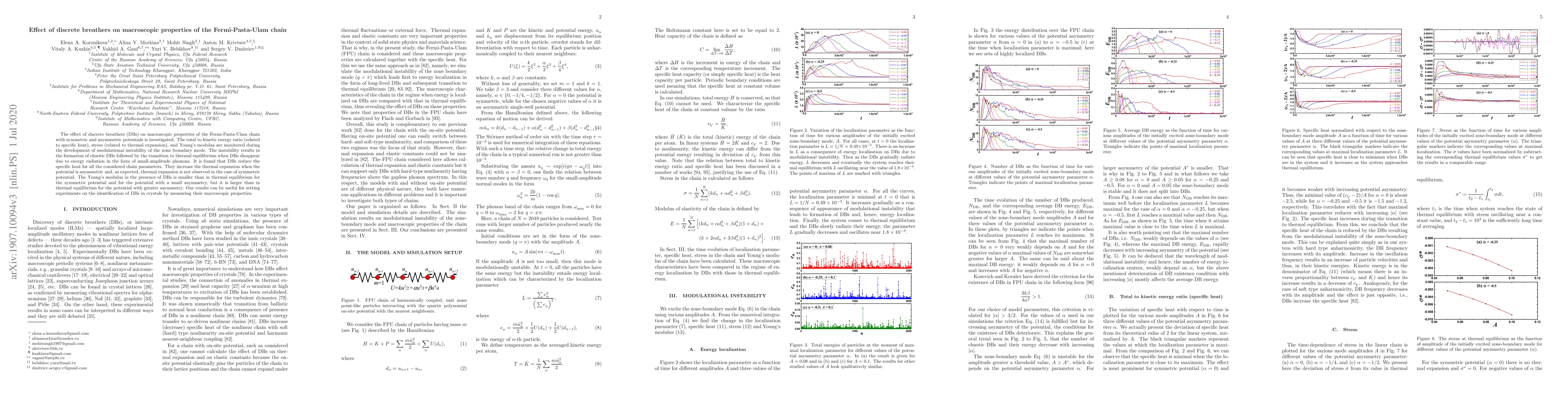 The effect of discrete breathers (DBs) on macroscopic properties of the Fermi-Pasta-Ulam chain with symmetric and asymmetric potentials is investigated. The total to kinetic energy ratio (related to specific heat), stress (related to thermal expansion), and Young's modulus are monitored during the development of modulational instability of the zone boundary mode. The instability results in the formation of chaotic DBs followed by the transition to thermal equilibrium when DBs disappear due to energy radiation in the form of small-amplitude phonons. It is found that DBs reduce the specific heat for all the considered chain parameters. They increase the thermal expansion when the potential is asymmetric and, as expected, thermal expansion is not observed in the case of symmetric potential. The Young's modulus in the presence of DBs is smaller than in thermal equilibrium for the symmetric potential and for the potential with a small asymmetry, but it is larger than in thermal equilibrium for the potential with greater asymmetry. Our results can be useful for setting experiments on the identification of DBs in crystals by measuring their macroscopic properties.