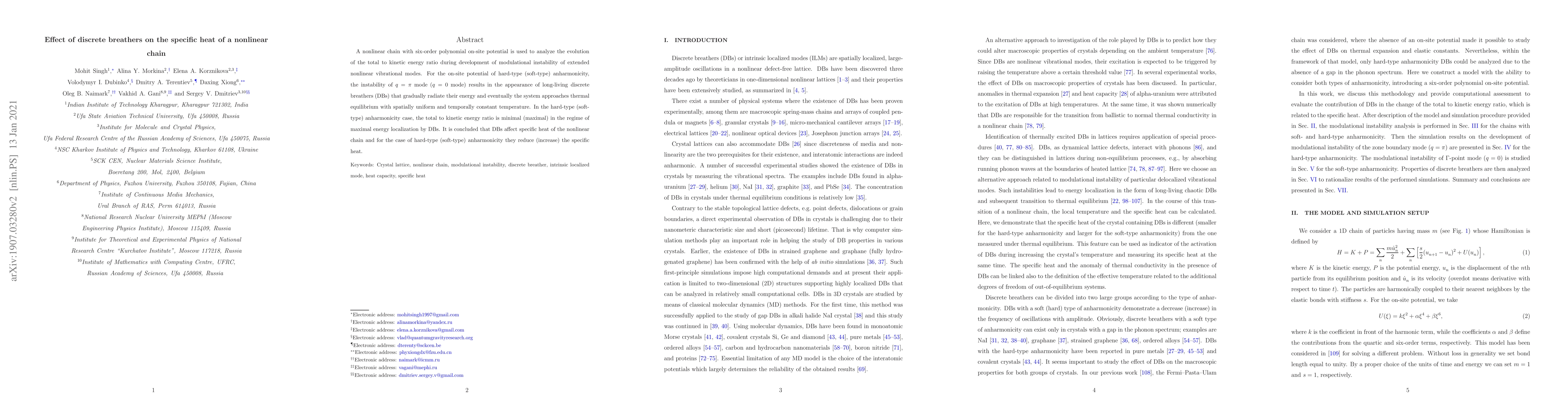 A nonlinear chain with six-order polynomial on-site potential is used to analyze the evolution of the total to kinetic energy ratio during development of modulational instability of extended nonlinear vibrational modes. For the on-site potential of hard-type (soft-type) anharmonicity, the instability of $q=\pi$ mode ($q=0$ mode) results in the appearance of long-living discrete breathers (DBs) that gradually radiate their energy and eventually the system approaches thermal equilibrium with spatially uniform and temporally constant temperature. In the hard-type (soft-type) anharmonicity case, the total to kinetic energy ratio is minimal (maximal) in the regime of maximal energy localization by DBs. It is concluded that DBs affect specific heat of the nonlinear chain and for the case of hard-type (soft-type) anharmonicity they reduce (increase) the specific heat.