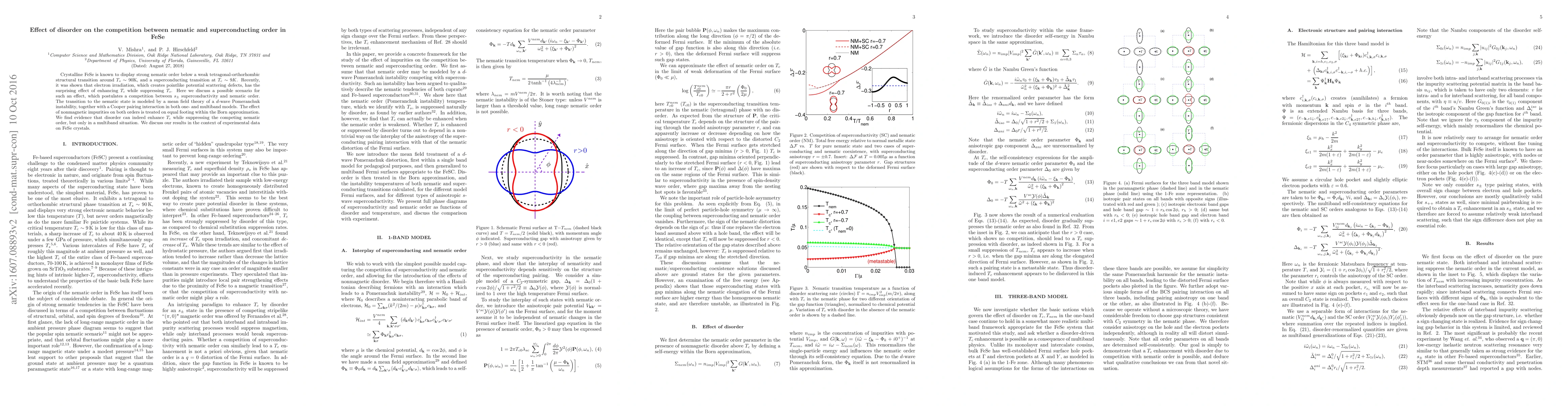 This study explores how disorder from electron irradiation affects the interplay between nematic order and superconductivity in FeSe, finding that nonmagnetic impurities can enhance $T_c$ while diminishing nematic order, particularly in a multiband framework. The results align with experimental observations of FeSe.