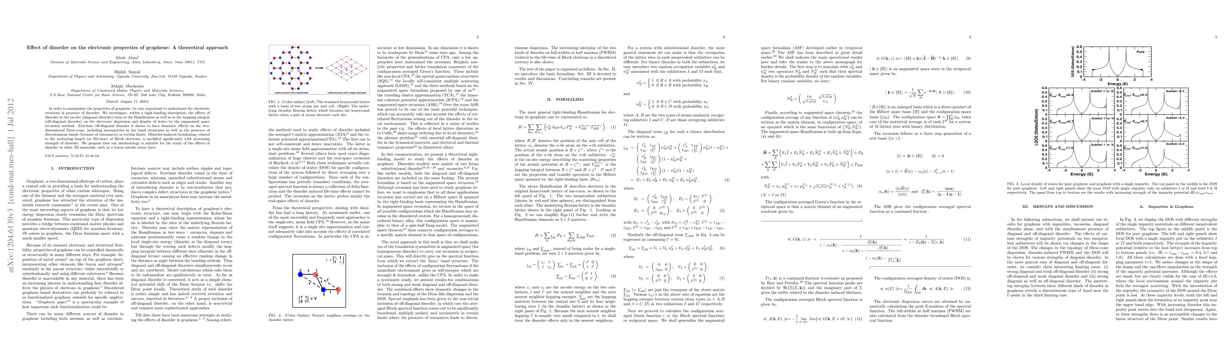 In order to manipulate the properties of graphene, its very important to understand the electronic structure in presence of disorder. We investigate, within a tight-binding description, the effects of disorder in the on-site (diagonal disorder) term in the Hamiltonian as well as in the hopping integral (off-diagonal disorder) on the electronic dispersion and density of states by augmented space recursion method. Extrinsic off-diagonal disorder is shown to have dramatic effects on the two-dimensional Dirac-cone, including asymmetries in the band structures as well as the presence of discontinuous bands in certain limits. Disorder-induced broadening, related to the scattering length (or life-time) of electrons, is modified significantly with the increasing strength of disorder. We propose that our theory is suitable to study the effects of disorder in other 2D materials, e.g., a boron nitride monolayer.
