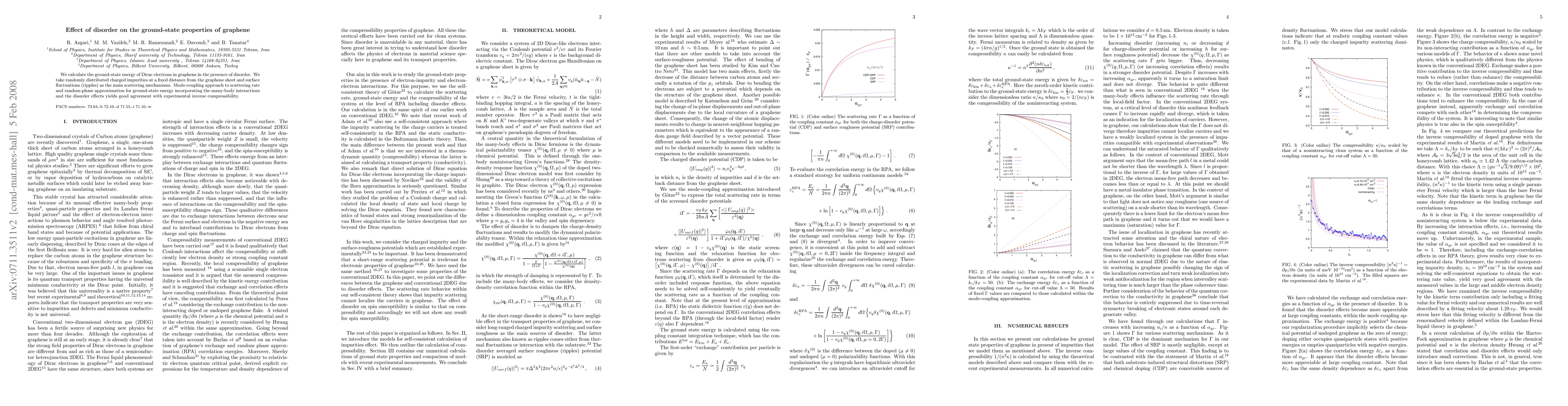 This study investigates how randomly distributed charged impurities and surface ripples affect the ground-state energy of Dirac electrons in graphene, employing a mode-coupling approach for scattering rates and random-phase approximation for many-body interactions, showing good experimental agreement for inverse compressibility.
