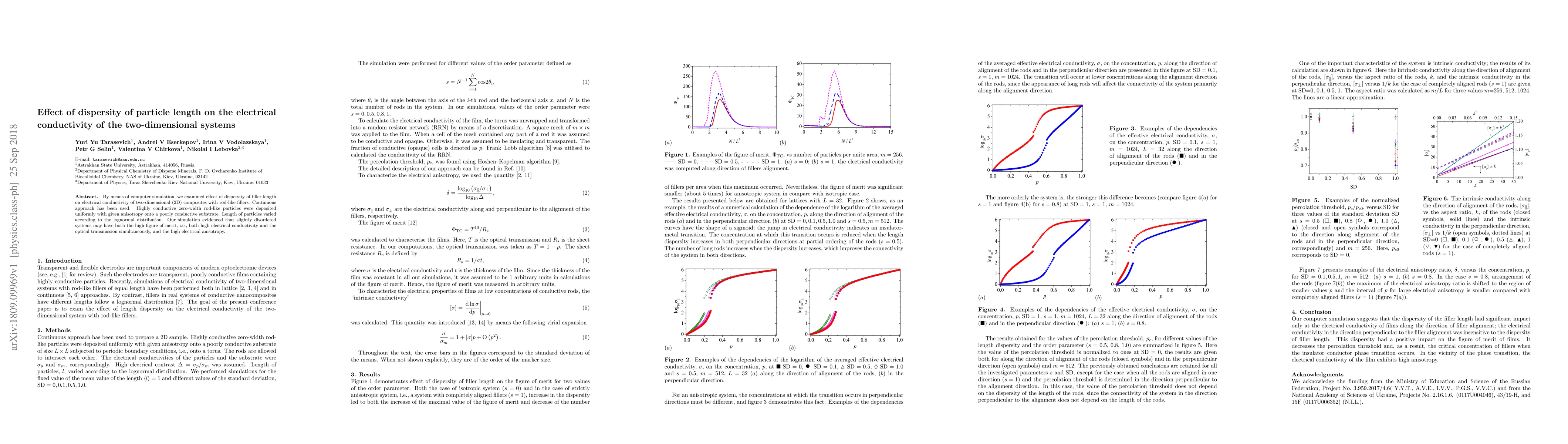 By means of computer simulation, we examined effect of dispersity of filler length on electrical conductivity of two-dimensional (2D) composites with rod-like fillers. Continuous approach has been used. Highly conductive zero-width rod-like particles were deposited uniformly with given anisotropy onto a poorly conductive substrate. Length of particles varied according to the lognormal distribution. Our simulation evidenced that slightly disordered systems may have both the high figure of merit, i.e., both high electrical conductivity and the optical transmission simultaneously, and the high electrical anisotropy.