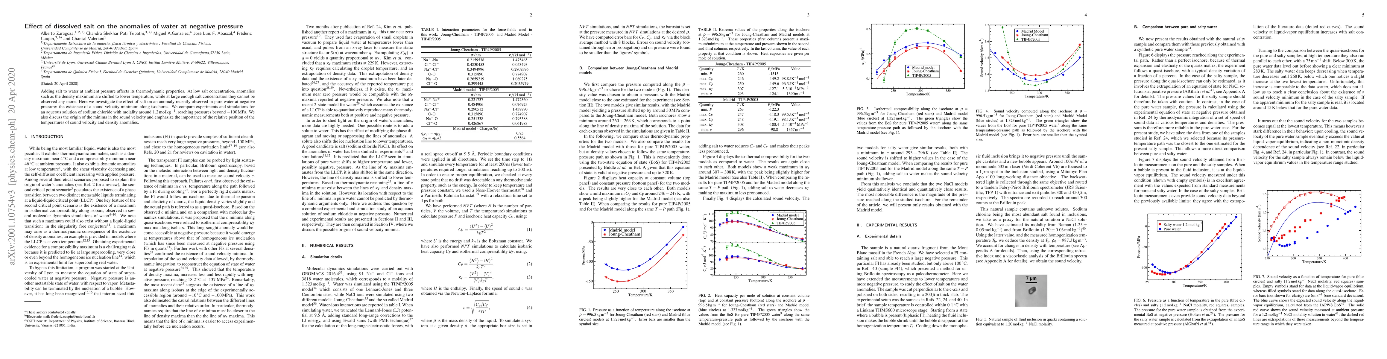 This paper investigates how dissolved salt affects anomalies in water under negative pressure, specifically focusing on the sound velocity minimum observed in pure water. Experiments and simulations show that salt alters these anomalies, emphasizing the significance of the relative positions of sound velocity and density anomalies.