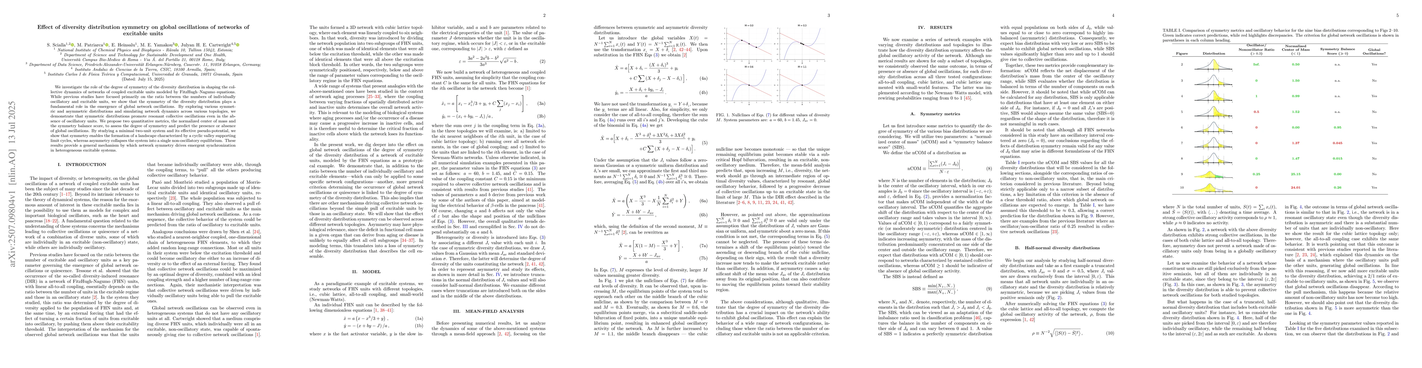 We investigate the role of the degree of symmetry of the diversity distribution in shaping the collective dynamics of networks of coupled excitable units modeled by FitzHugh-Nagumo equations. While previous studies have focused primarily on the ratio between the numbers of individually oscillatory and excitable units, we show that the symmetry of the diversity distribution plays a fundamental role in the emergence of global network oscillations. By exploring various symmetric and asymmetric distributions and simulating network dynamics across various topologies, we demonstrate that symmetric distributions promote resonant collective oscillations even in the absence of oscillatory units. We propose two quantitative metrics, the normalized center of mass and the symmetry balance score, to assess the degree of symmetry and predict the presence or absence of global oscillations. By studying a minimal two-unit system and its effective pseudo-potential, we show that symmetry enables the formation of a landscape characterized by a cyclic valley supporting limit cycles, whereas asymmetry collapses the system into a single non-oscillatory equilibrium. These results provide a general mechanism by which network symmetry drives emergent synchronization in heterogeneous excitable systems.