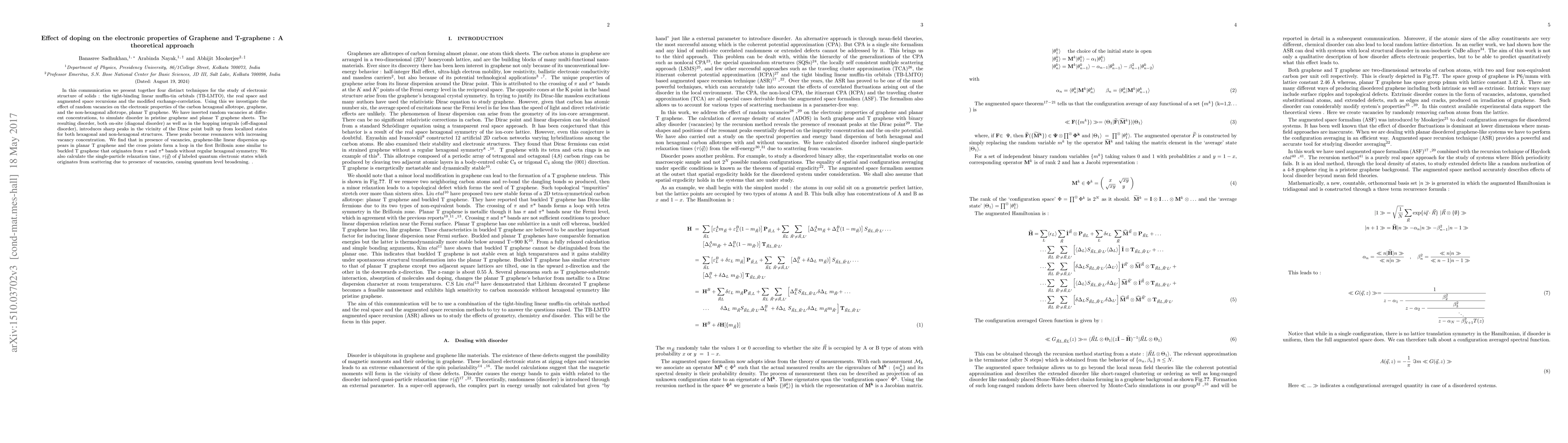 In this communication we present together four distinct techniques for the study of electronic structure of solids : the tight-binding linear muffin-tin orbitals (TB-LMTO), the real space and augmented space recursions and the modified exchange-correlation. Using this we investigate the effect of random vacancies on the electronic properties of the carbon hexagonal allotrope, graphene, and the non-hexagonal allotrope, planar T graphene. We have inserted random vacancies at different concentrations, to simulate disorder in pristine graphene and planar T graphene sheets. The resulting disorder, both on-site (diagonal disorder) as well as in the hopping integrals (off-diagonal disorder), introduces sharp peaks in the vicinity of the Dirac point built up from localized states for both hexagonal and non-hexagonal structures. These peaks become resonances with increasing vacancy concentration. We find that in presence of vacancies, graphene-like linear dispersion appears in planar T graphene and the cross points form a loop in the first Brillouin zone similar to buckled T graphene that originates from $\pi$ and $\pi$* bands without regular hexagonal symmetry. We also calculate the single-particle relaxation time, $\tau(\vec{q})$ of $\vec{q}$ labeled quantum electronic states which originates from scattering due to presence of vacancies, causing quantum level broadening.