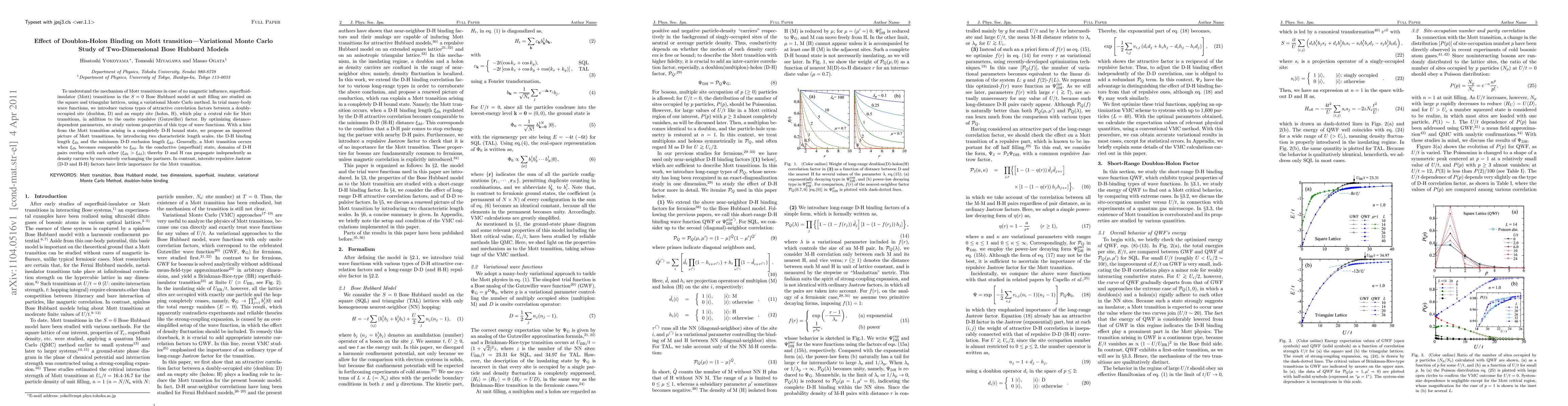 To understand the mechanism of Mott transitions in case of no magnetic influence, superfluid-insulator (Mott) transitions in the S=0 Bose Hubbard model at unit filling are studied on the square and triangular lattices, using a variational Monte Carlo method. In trial many-body wave functions, we introduce various types of attractive correlation factors between a doubly-occupied site (doublon, D) and an empty site (holon, H), which play a central role for Mott transitions, in addition to the onsite repulsive (Gutzwiller) factor. By optimizing distance-dependent parameters, we study various properties of this type of wave functions. With a hint from the Mott transition arising in a completely D-H bound state, we propose an improved picture of Mott transitions, by introducing two characteristic length scales, the D-H binding length $\xi_{\rm dh}$ and the minimum D-D exclusion length $\xi_{\rm dd}$. Generally, a Mott transition occurs when $\xi_{\rm dh}$ becomes comparable to $\xi_{\rm dd}$. In the conductive (superfluid) state, domains of D-H pairs overlap with each other ($\xi_{\rm dh}>\xi_{\rm dd}$); thereby D and H can propagate independently as density carriers by successively exchanging the partners. In contrast, intersite repulsive Jastrow (D-D and H-H) factors have little importance for the Mott transition.
