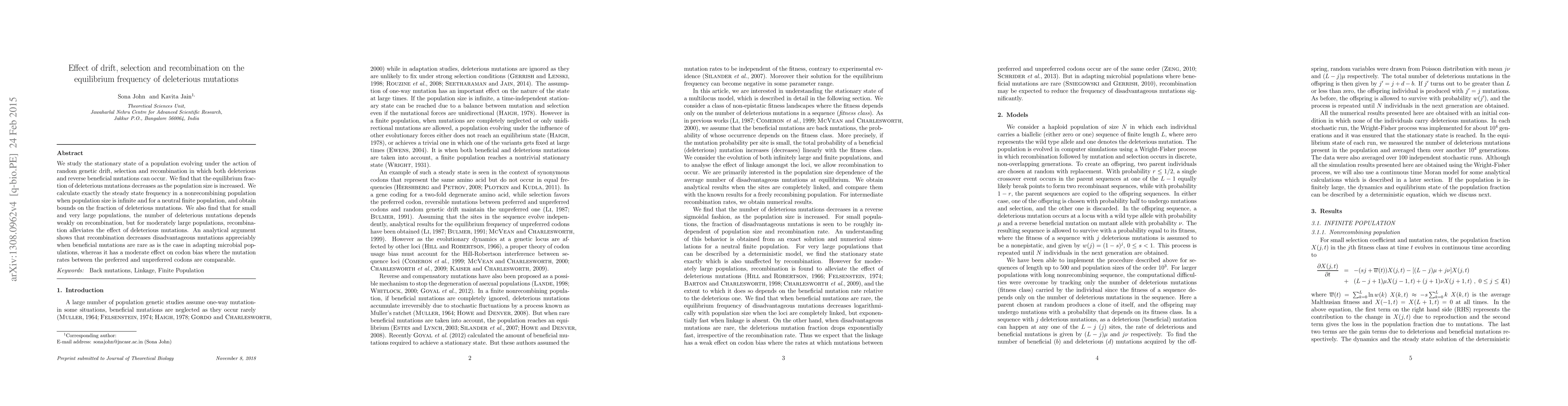 This paper investigates the equilibrium frequency of deleterious mutations under genetic drift, selection, and recombination. It finds that the equilibrium fraction of deleterious mutations decreases with larger population sizes, and recombination alleviates the effect of deleterious mutations, especially in adapting microbial populations where beneficial mutations are rare.