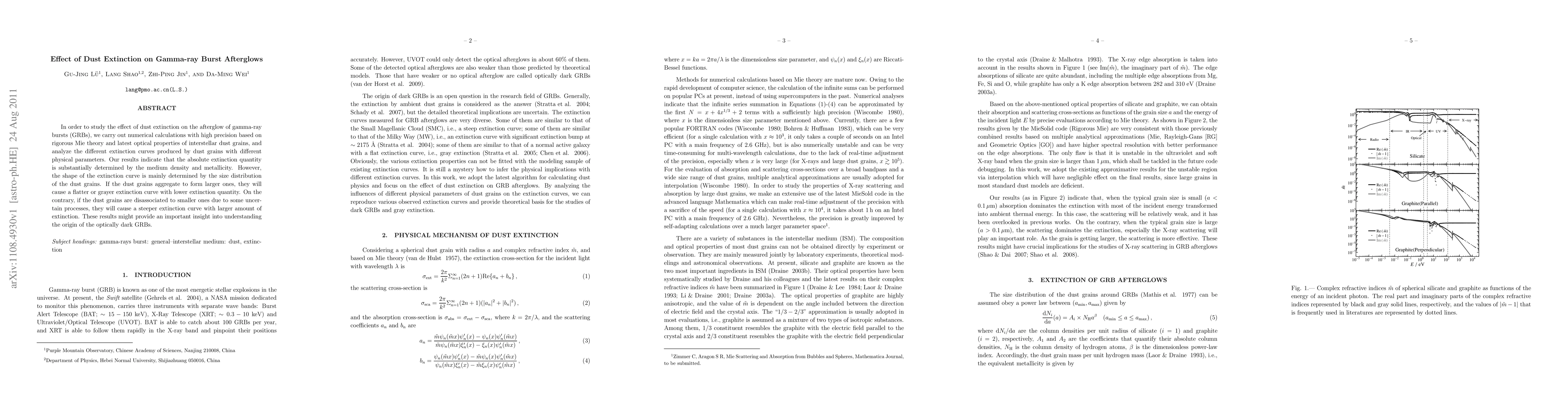 Researchers studied how dust extinction affects gamma-ray burst afterglows, finding that dust size distribution is key to determining the shape of extinction curves, which can impact our understanding of optically dark GRBs.