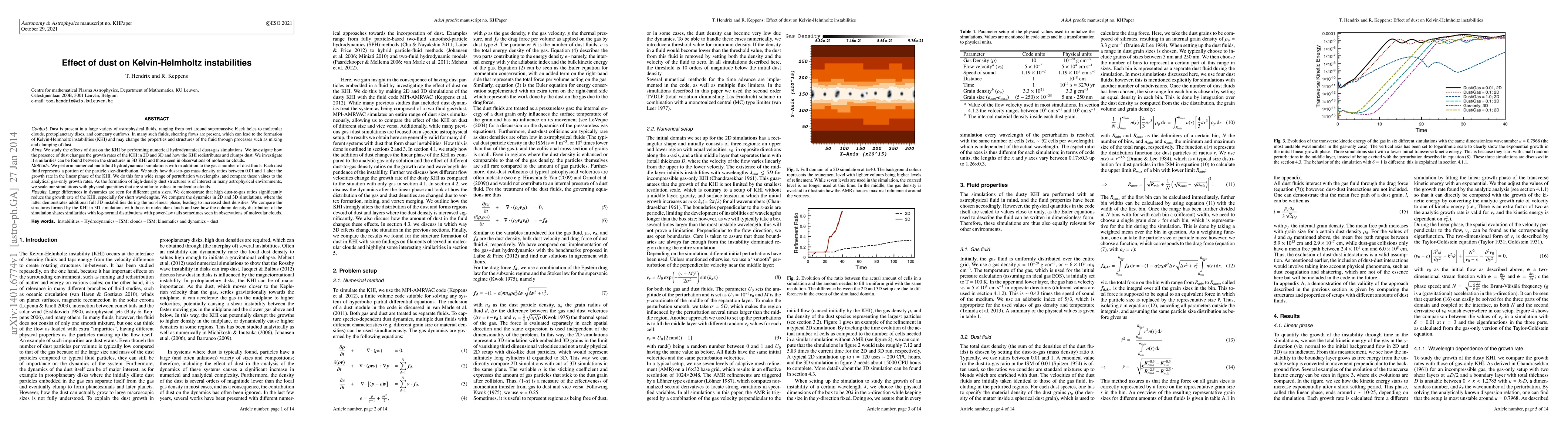 This research investigates how dust influences the growth rates and dynamics of Kelvin-Helmholtz instabilities (KHI) in astrophysical fluids, using numerical simulations. High dust-to-gas ratios significantly reduce KHI growth rates, especially for short wavelengths, and 3D simulations show enhanced dust clumping and density structures resembling those observed in molecular clouds.