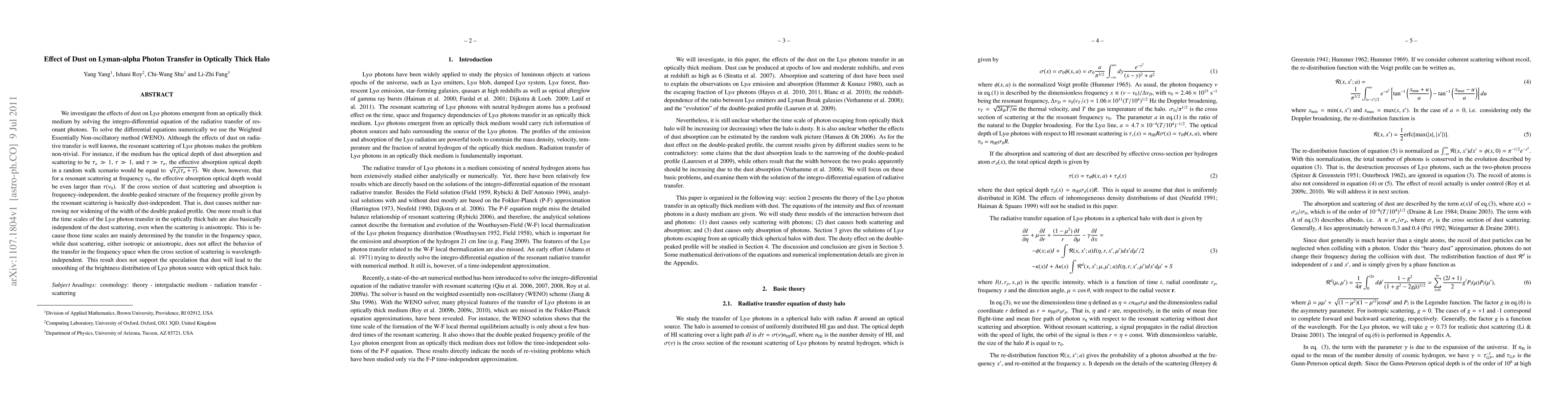 This paper examines the influence of dust on the transfer of Lyman-alpha (Lyα) photons in optically thick halos, finding that dust does not significantly alter the double-peaked frequency profile or the time scales of photon transfer, despite its known effects on radiative transfer.