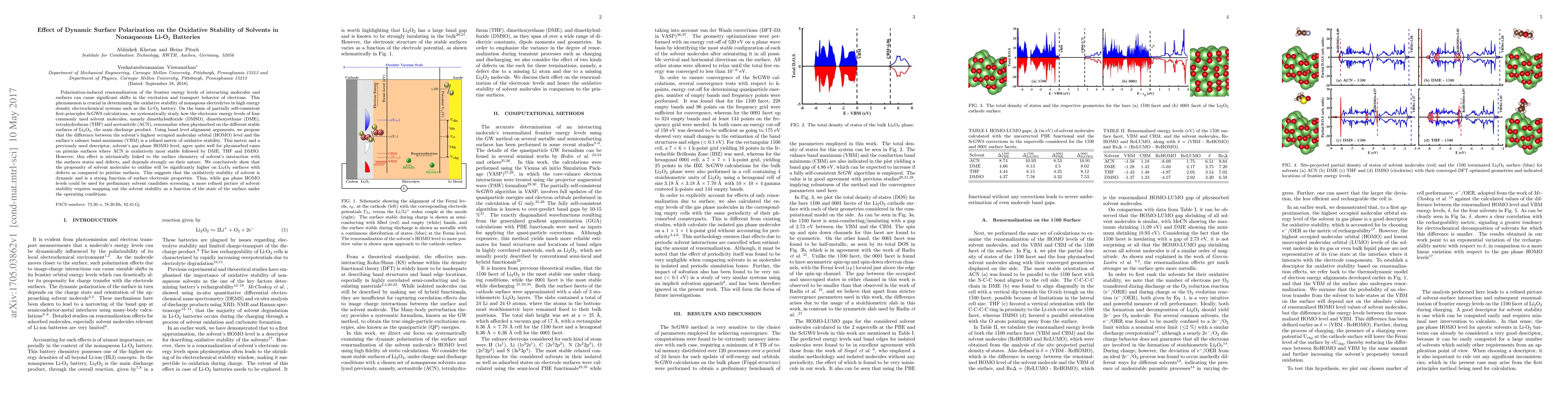 The study investigates how dynamic surface polarization affects the oxidative stability of solvents in non-aqueous Li-O2 batteries. It reveals that solvent molecules' propensity to oxidize varies significantly with surface defects, suggesting a dynamic relationship between surface properties and oxidative stability.