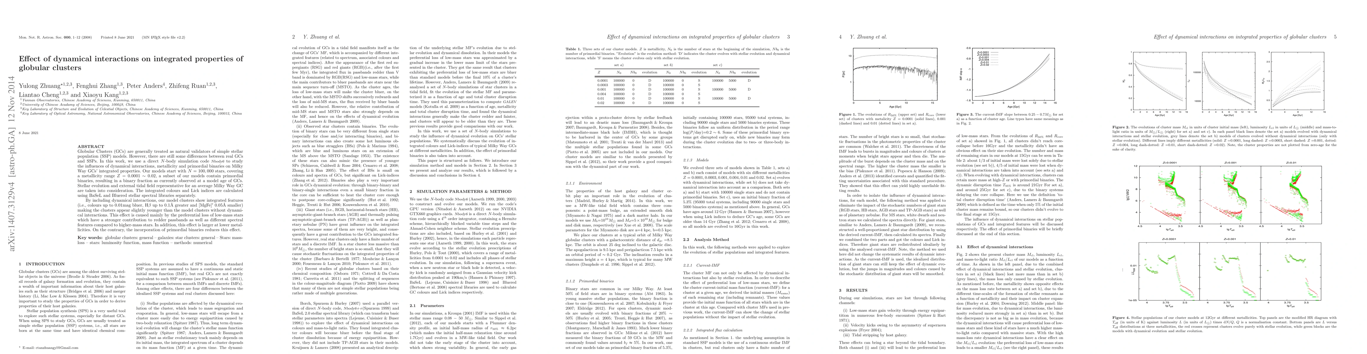 Globular Clusters (GCs) are generally treated as natural validators of simple stellar population (SSP) models. However, there are still some differences between real GCs and SSPs. In this work we use a direct $N$-body simulation code {\hf Nbody6} to study the influences of dynamical interactions, metallicity and primordial binaries on Milky Way globular clusters' integrated properties. Our models start with $N=100,000$ stars, covering a metallicity range $Z=0.0001-0.02$, a subset of our models contain primordial binaries, resulting in a binary fraction as currently observed at a model age of GCs.Stellar evolution and external tidal field representative for an average Milky Way GC are taken into consideration. The integrated colours and Lick indices are calculated using BaSeL and Bluered stellar spectral libraries separately. By including dynamical interactions, our model clusters show integrated features (colours up to 0.01mag bluer, H$\beta$ up to 0.1\AA $ $ greater and [MgFe]$'$ 0.05\AA $ $ smaller) making the clusters appear slightly younger than the model clusters without dynamical interactions. This effect is caused mainly by the preferential loss of low-mass stars which have a stronger contribution to redder passbands as well as different spectral features compared to higher-mass stars. In addition, this effect is larger at lower metallicities. On the contrary, the incorporation of primordial binaries reduces this effect.