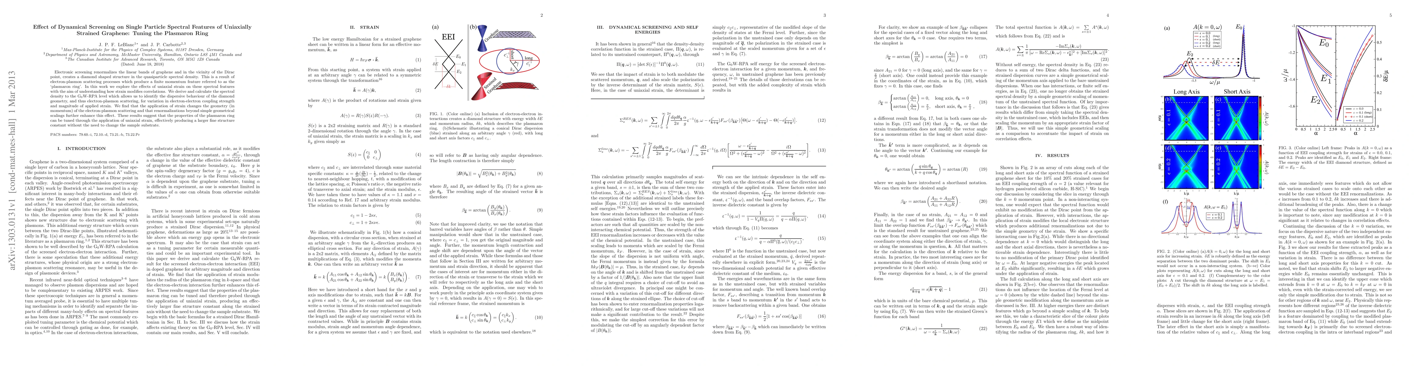 Electronic screening renormalizes the linear bands of graphene and in the vicinity of the Dirac point, creates a diamond shaped structure in the quasiparticle spectral density. This is a result of electron-plasmon scattering processes which produce a finite momentum feature referred to as the `plasmaron ring'. In this work we explore the effects of uniaxial strain on these spectral features with the aim of understanding how strain modifies correlations. We derive and calculate the spectral density to the G$_0$W-RPA level which allows us to identify the dispersive behaviour of the diamond geometry, and thus electron-plasmon scattering, for variation in electron-electron coupling strength and magnitude of applied strain. We find that the application of strain changes the geometry (in momentum) of the electron-plasmon scattering and that renormalizations beyond simple geometrical scalings further enhance this effect. These results suggest that the properties of the plasmaron ring can be tuned through the application of uniaxial strain, effectively producing a larger fine structure constant without the need to change the sample substrate.