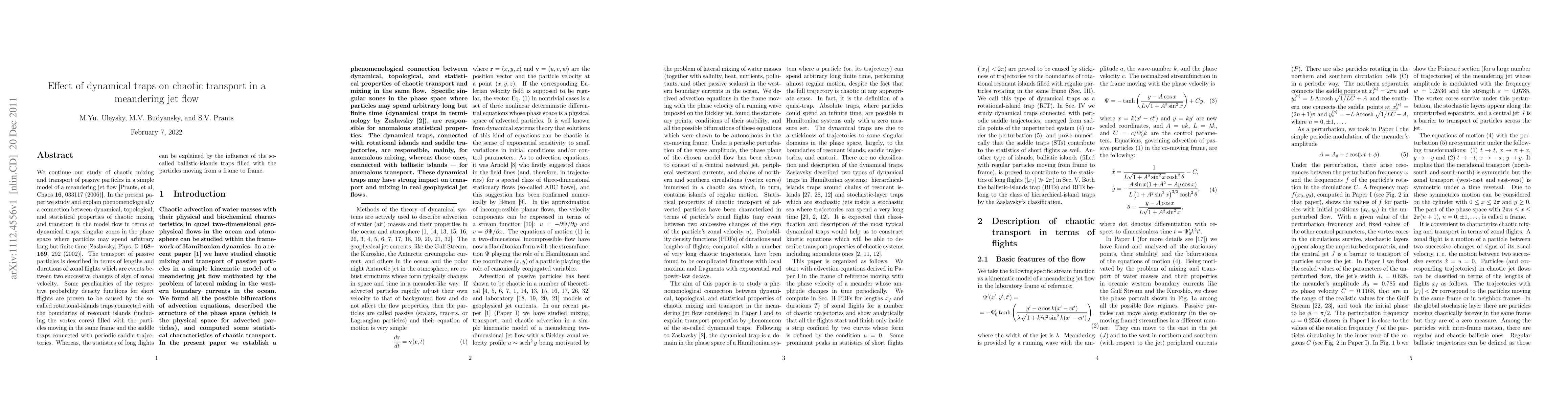 This paper investigates the impact of dynamical traps on chaotic transport in a meandering jet flow, linking dynamical, topological, and statistical properties of chaotic mixing to singular zones in phase space. It identifies rotational-islands and saddle traps affecting short flights and ballistic-islands traps influencing long flights.