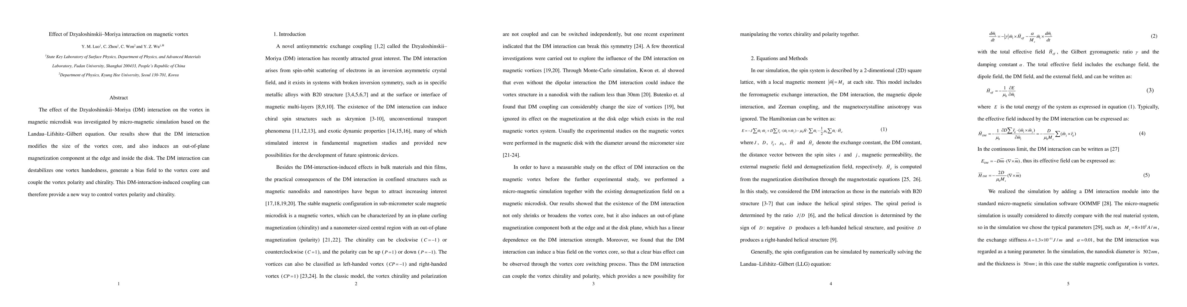 The Dzyaloshinskii Moriya interaction (DMI) modifies the size of the vortex core and induces out-of-plane magnetization in magnetic microdisks, potentially destabilizing vortex handedness and enabling new control over vortex polarity and chirality.