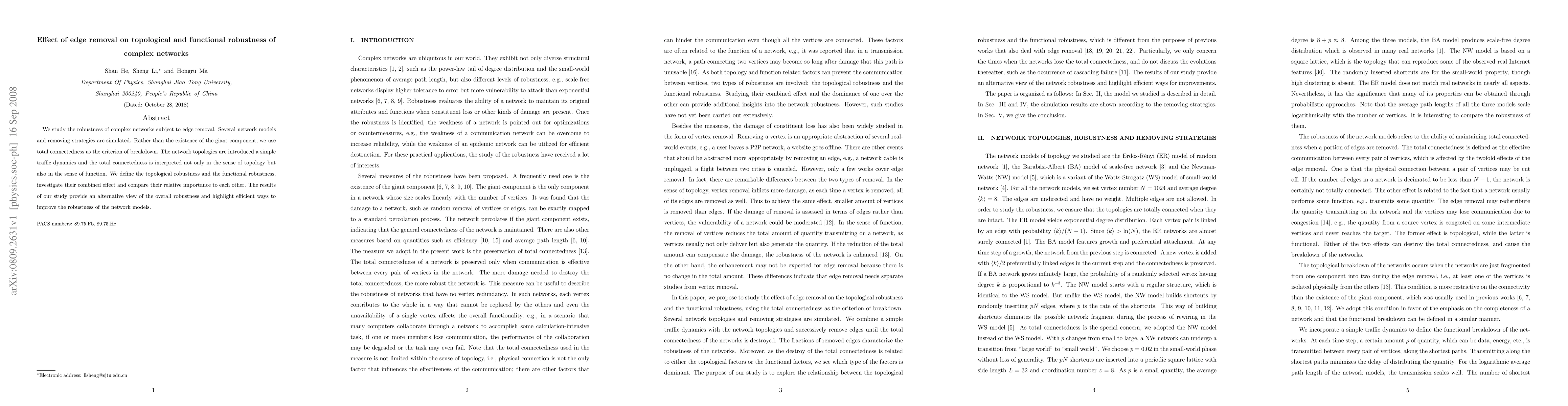 Researchers studied how removing edges from complex networks affects their robustness to failures, finding that topological and functional robustness can differ in importance, and providing insights for improving network resilience.